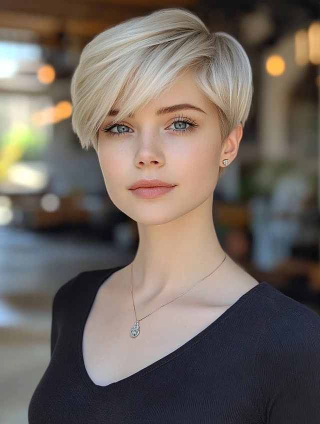 A close crop with a sweeping bang adds structure and style without overwhelming the face.