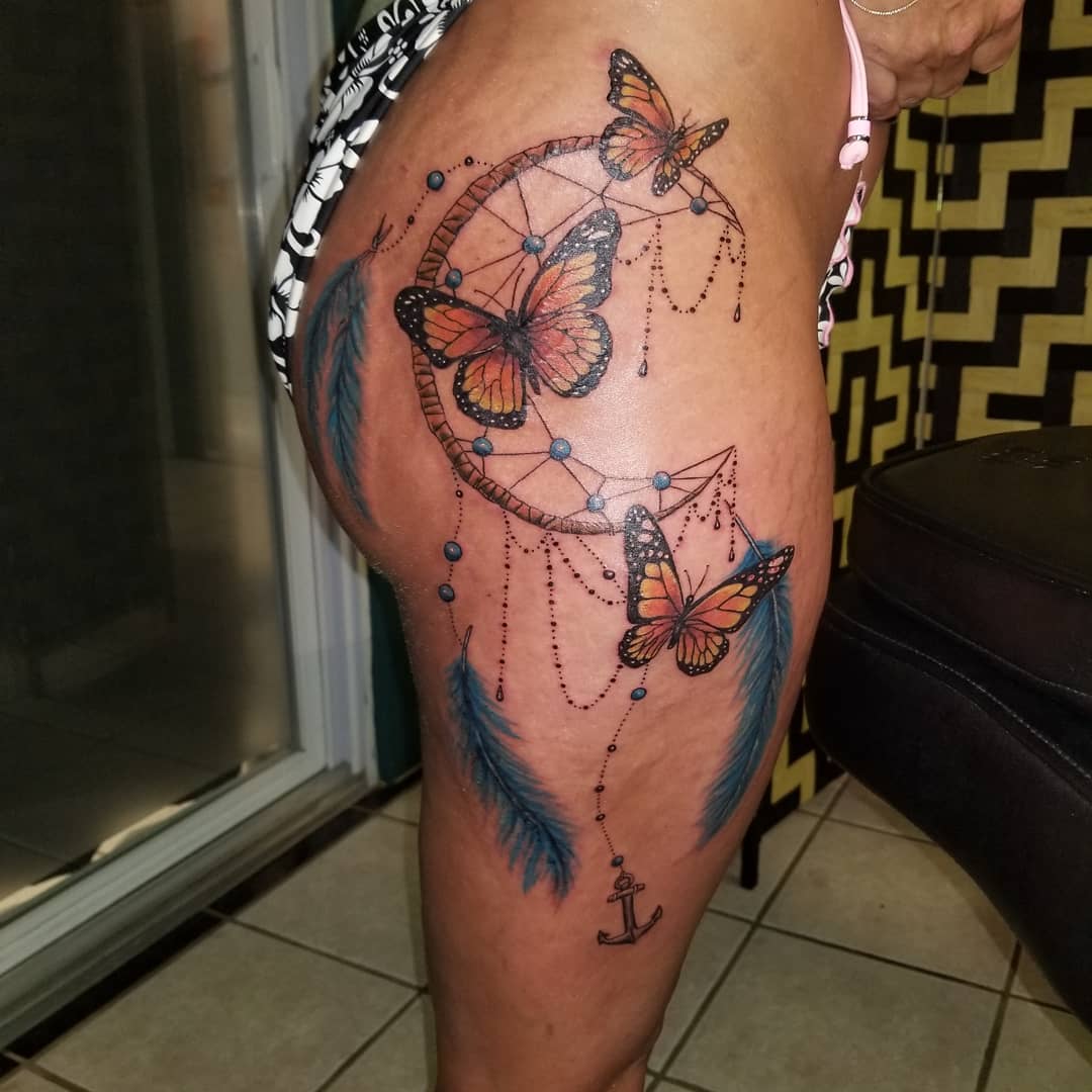 A vibrant thigh tattoo depicting monarch butterflies fluttering around a dreamcatcher adorned with beads, feathers, and a small anchor. The butterflies represent transformation and freedom, while the dreamcatcher is a symbol of protection and spirituality.