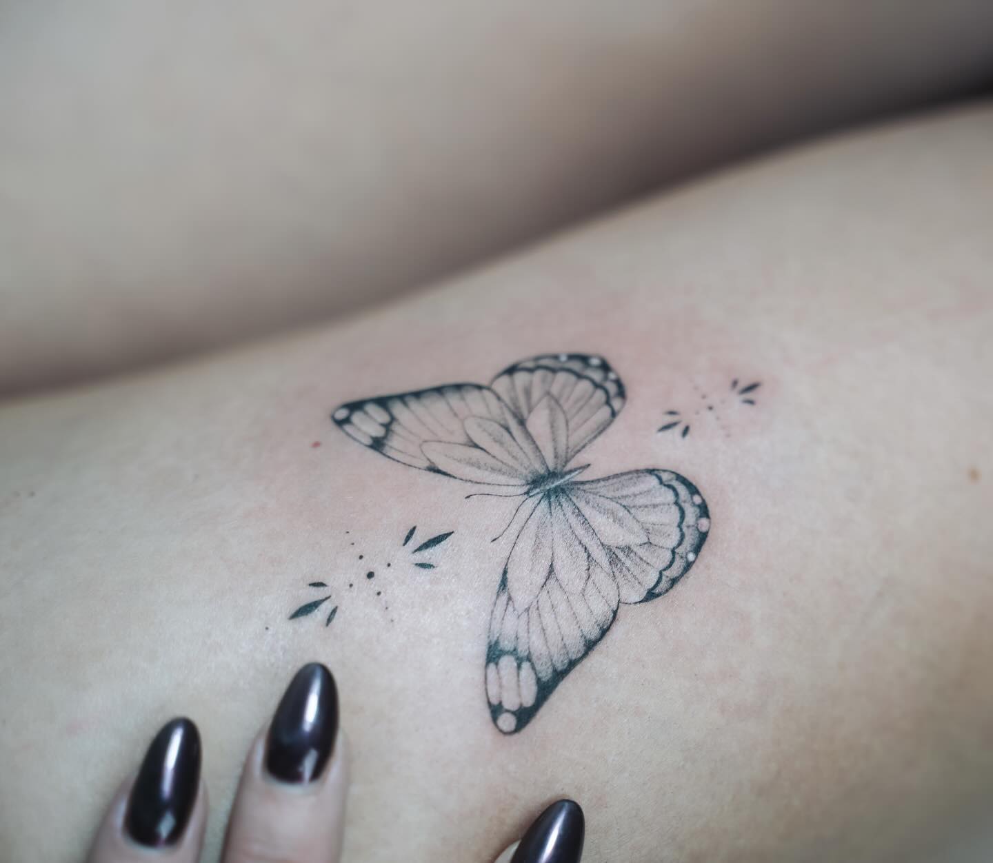 This delicate tattoo features a finely detailed butterfly inked in black and grey on the thigh, surrounded by subtle spark-like accents. Butterflies symbolize transformation, freedom, and new beginnings, making this design both meaningful and elegant.
