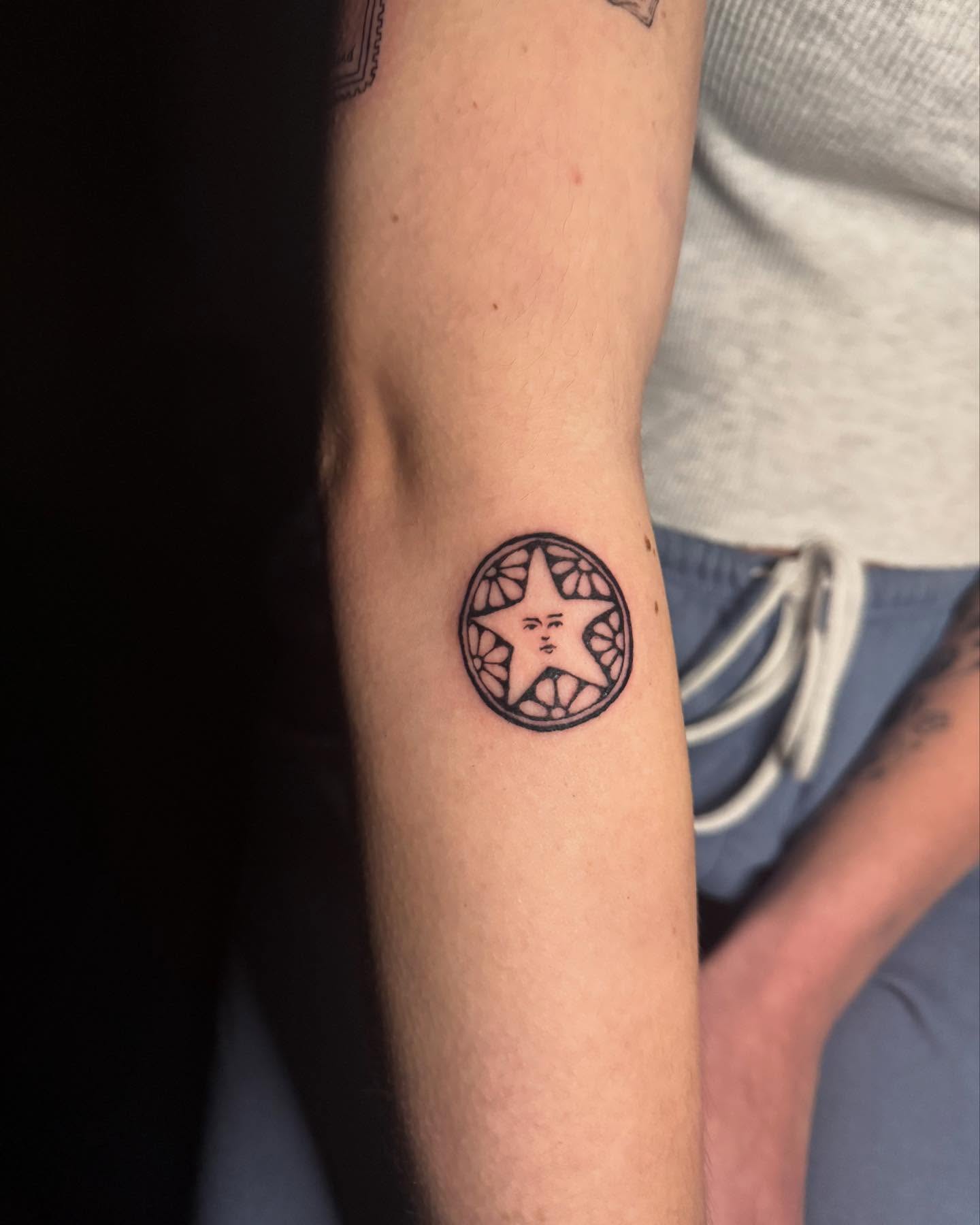 This striking tattoo features a bold star enclosed within a circular frame, complete with intricate geometric detailing. The star at the center is depicted with a human-like face, adding a mystical and celestial quality to the design.