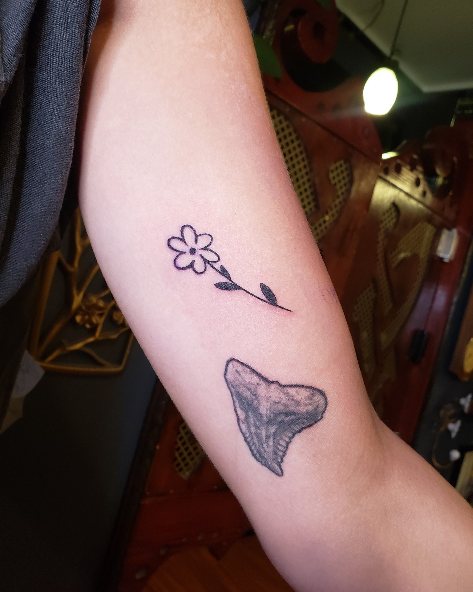 This tattoo depicts a minimalist daisy-like flower with a slender stem and leaves, inked on the inner arm. The flower symbolizes purity, innocence, and new beginnings, making it a gentle and positive design. Its placement ensures visibility yet feels intimate, perfectly suited for personal symbolism.