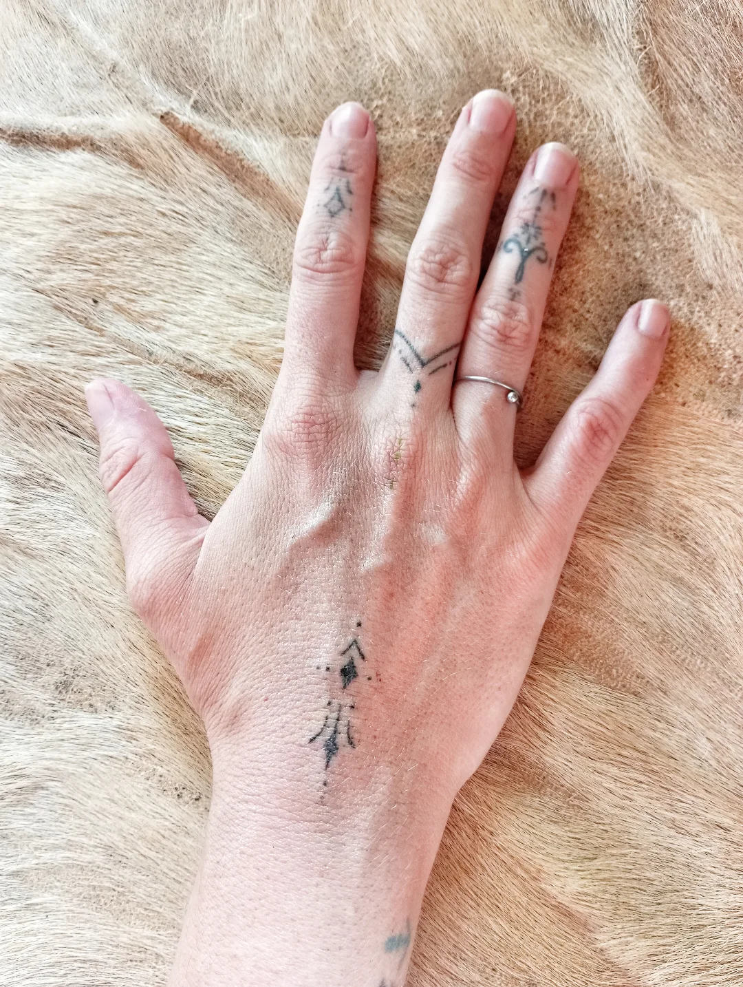 This hand and finger tattoo showcases a delicate series of tribal-inspired shapes and dots, forming a geometric yet organic pattern. With subtle linework on the fingers and back of the hand, it evokes an ancient and earthy aesthetic. These fine symbols may represent protection, energy, or personal strength, offering both beauty and cultural resonance.
