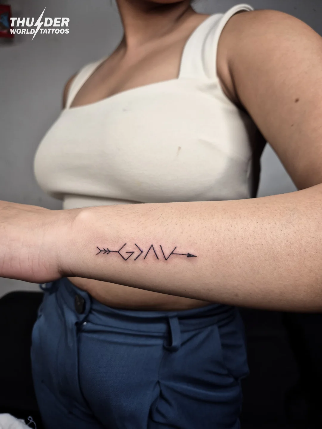 This forearm tattoo features an arrow integrated with symbolic script that reads “God is greater than the highs and lows.” Its sharp, bold lines emphasize direction, resilience, and faith, making it both meaningful and stylish. The arrow design traditionally represents moving forward, while the script adds spiritual depth, resonating with inner strength and divine guidance.