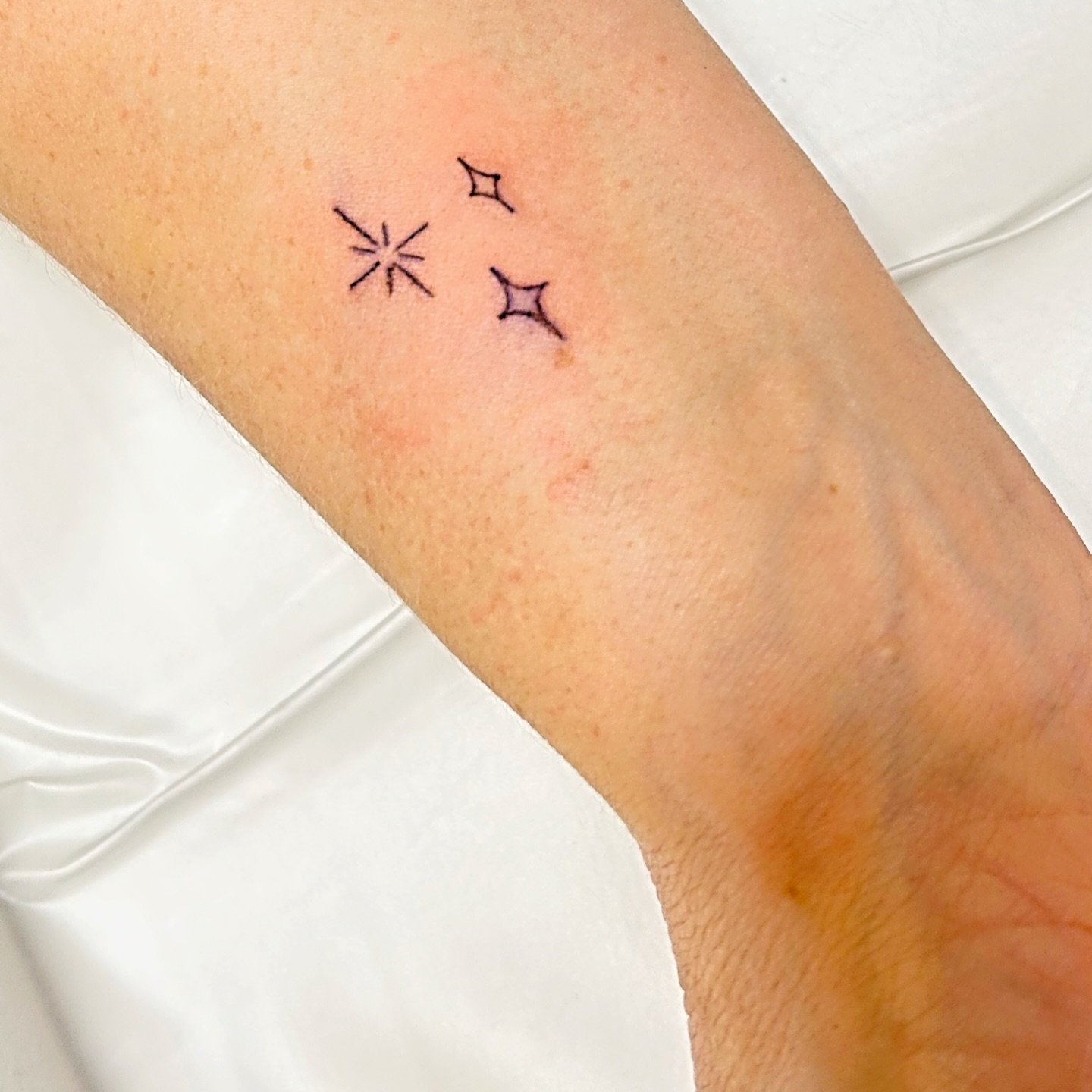 This forearm tattoo showcases three sparkling starburst shapes, evoking light, hope, and inspiration. The geometric simplicity adds modern elegance, while the stars themselves symbolize dreams and guidance. Its placement on the arm makes it a perfect reminder to follow your inner light daily.