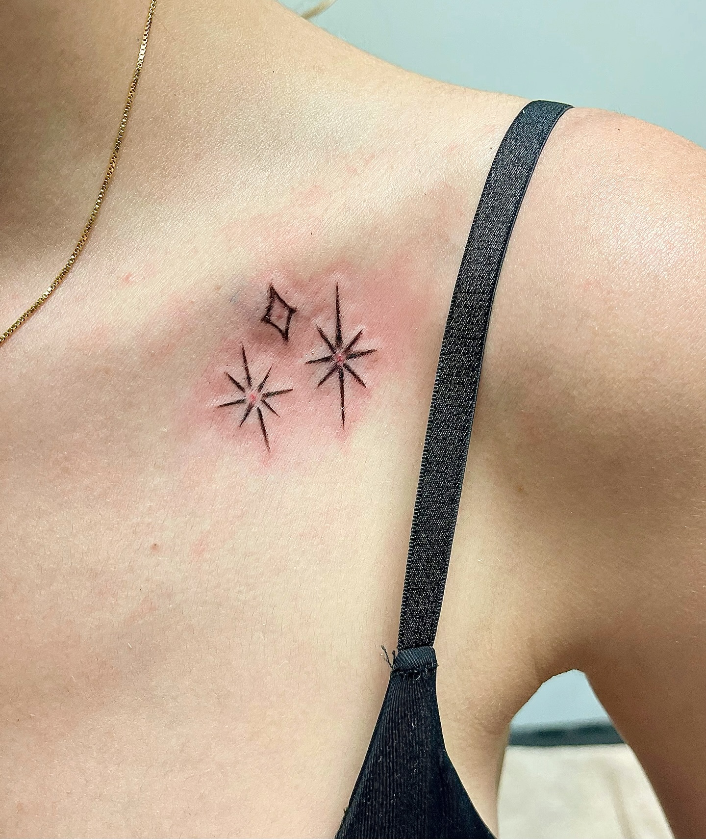 This tiny collarbone tattoo shines with a celestial motif featuring sparkling stars and geometric accents. The simple yet radiant linework makes it appear as though the skin itself is glowing. Stars symbolize hope, dreams, and guidance, making this design both decorative and meaningful.