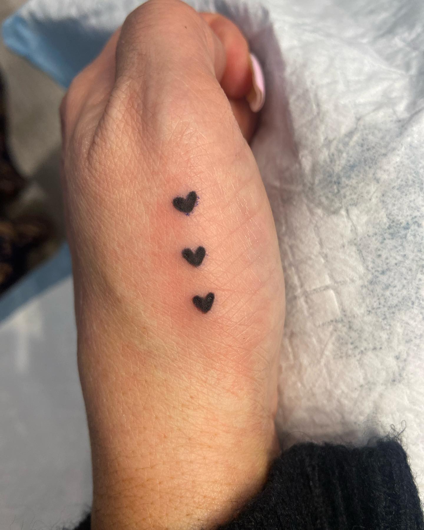 This tattoo displays three small hearts aligned vertically along the hand, symbolizing love, affection, and meaningful connections. Each heart can represent a loved one, a cherished memory, or stages of personal growth.