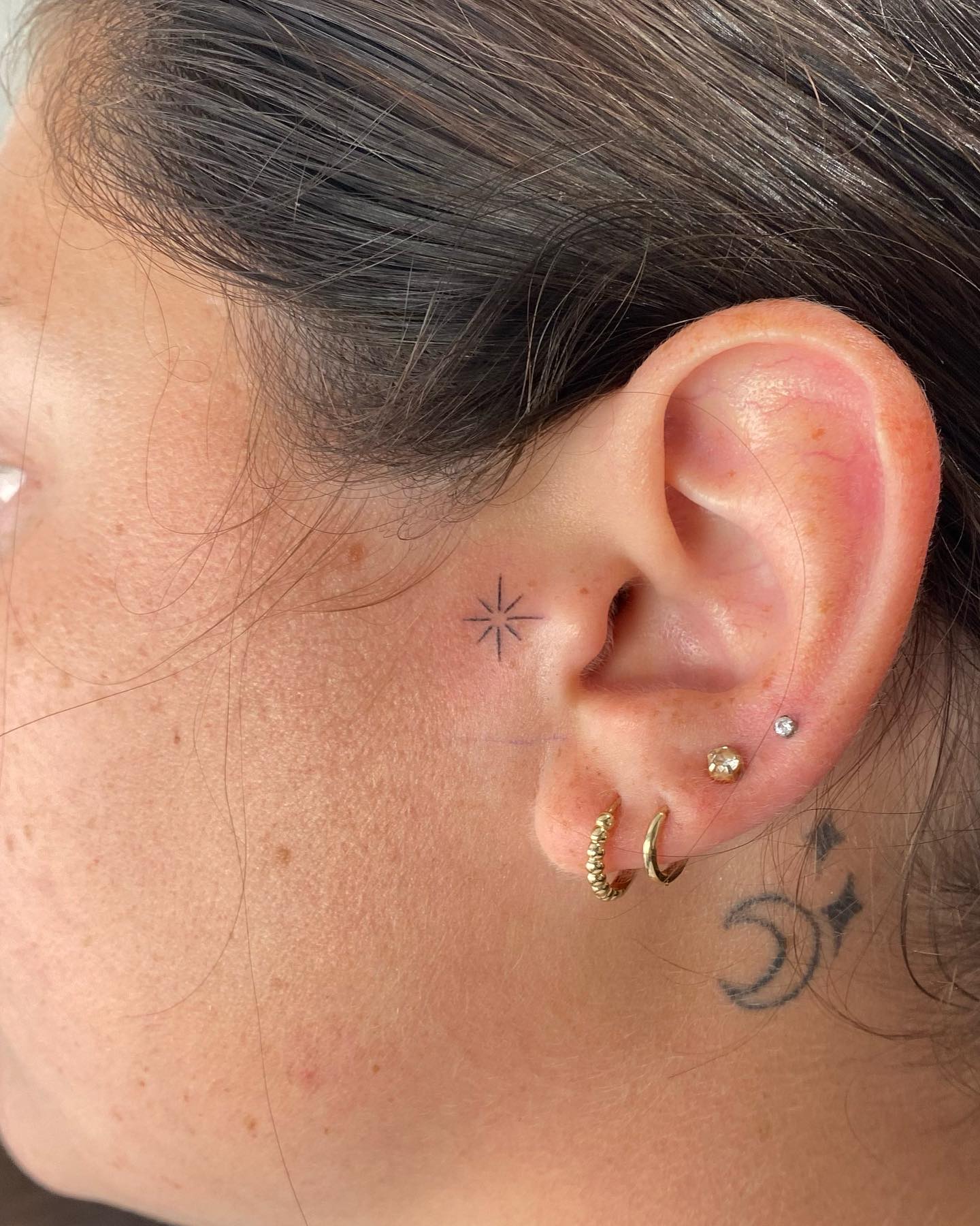 Placed subtly near the ear, this small star tattoo radiates charm and positivity. Its placement makes it discreet yet stylish, complementing facial features and ear piercings. The star symbolizes hope, dreams, and inner light, serving as a personal reminder of guidance and ambition.