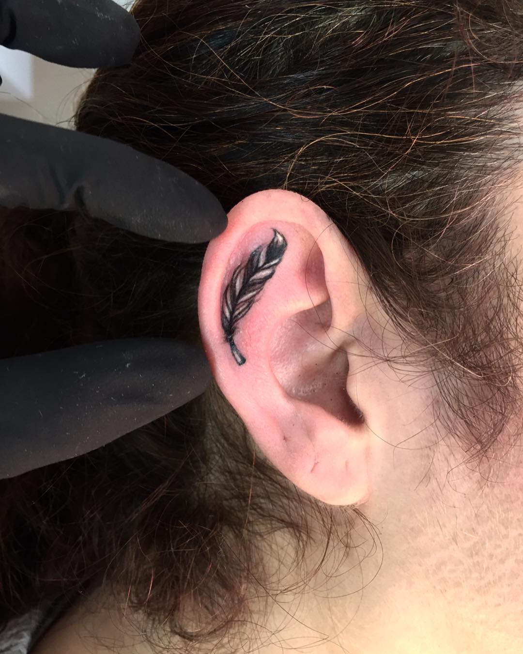 The fine shading brings the feather to life, giving it a natural flow. Ideal for those who want a discreet yet symbolic tattoo, it blends effortlessly with piercings and ear jewelry. It’s a delicate reminder of resilience, spirituality, and grace carried close to the mind and soul.