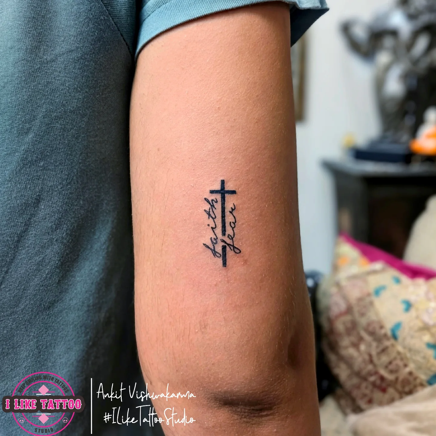 This tattoo combines a vertical cross with the words “faith” and “fear,” intersecting in a thoughtful, meaningful design. Its placement on the upper arm gives it prominence while maintaining simplicity. The cross symbolizes devotion and spirituality, while the text reinforces a message of overcoming fear through faith.