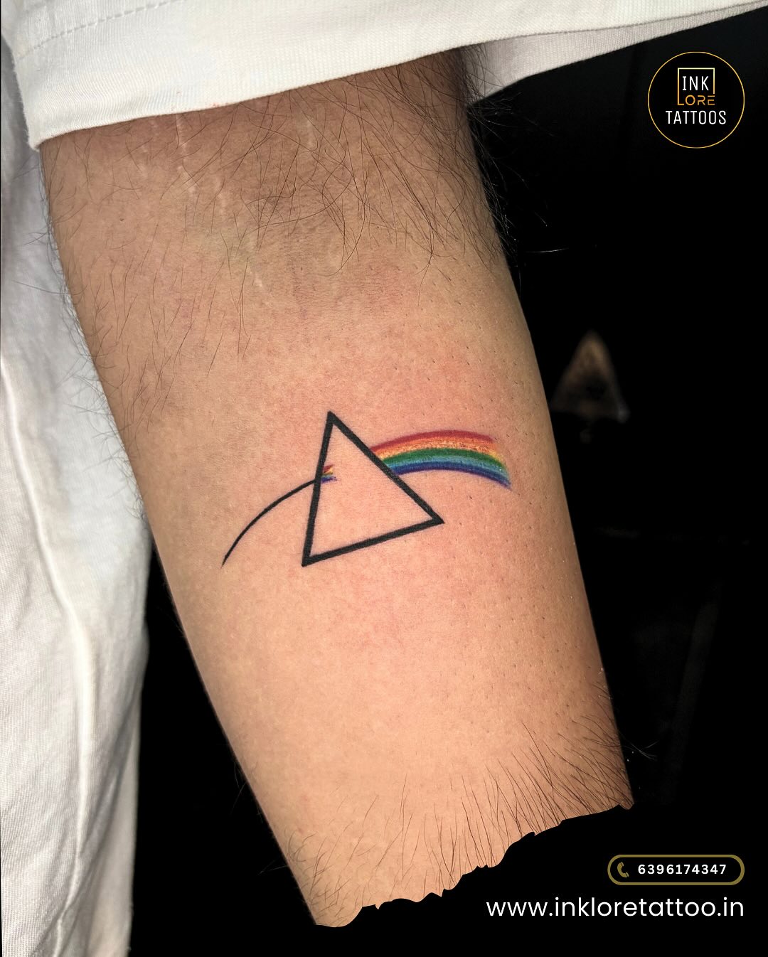 This geometric tattoo combines a black triangle with a rainbow spectrum emerging from it, resembling the iconic prism design. The tattoo symbolizes light, diversity, and transformation. Its use of both simple geometry and vibrant color creates a visually striking effect. Placed on the arm, it draws attention with its bold contrast while remaining compact.