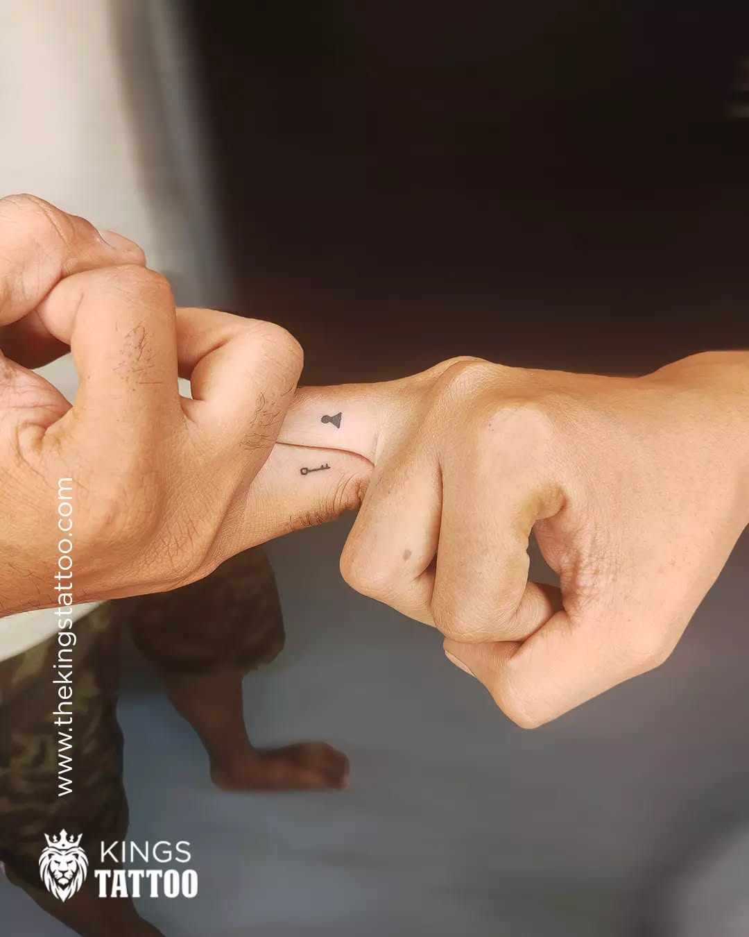 This paired finger tattoo features a small lock on one finger and a key on the other, symbolizing love, trust, and connection. The design is often chosen by couples or close friends to represent the idea that one holds the key to the other’s heart. Its miniature size makes it discreet yet meaningful, perfect for a personal touch.