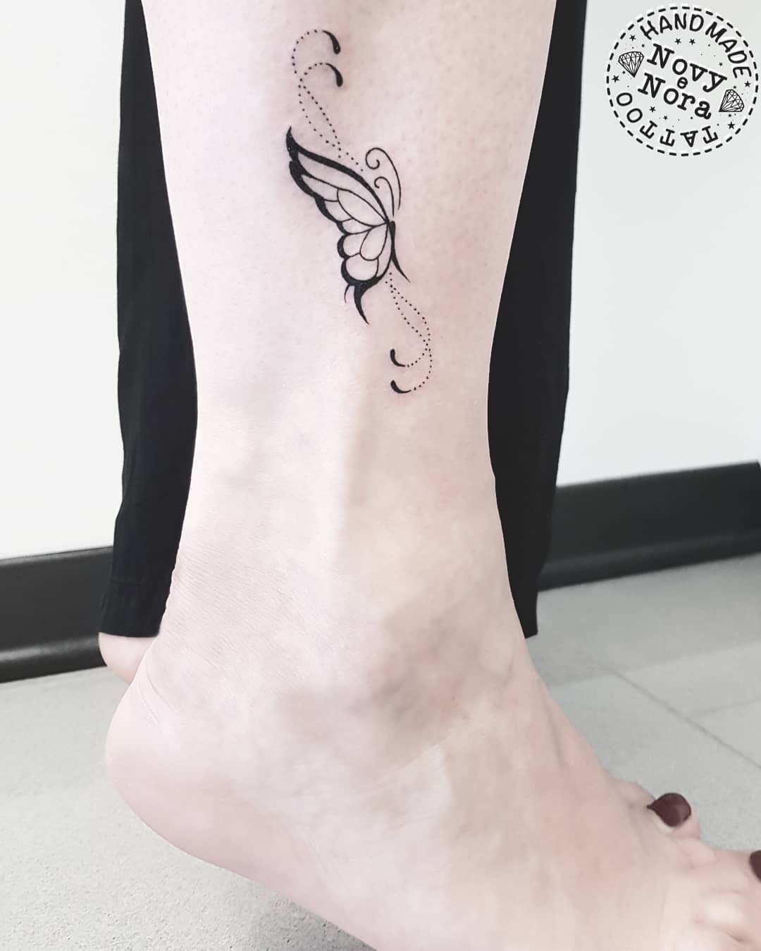 This ankle tattoo portrays a graceful butterfly wing surrounded by dotted swirls that enhance its movement and charm. The butterfly wing symbolizes transformation, beauty, and freedom, while the dotted flourishes add a whimsical and airy effect. Placed delicately on the side of the ankle, it creates a feminine, elegant look that draws attention with every step.