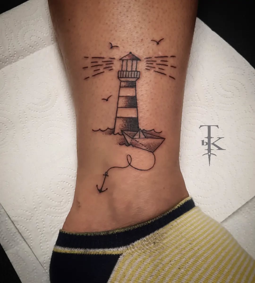 This ankle tattoo depicts a lighthouse shining its beams across the sea, with a paper boat anchored nearby. It symbolizes guidance, safety, and resilience through life’s storms. The lighthouse represents hope and strength, while the paper boat adds a whimsical, childlike charm.