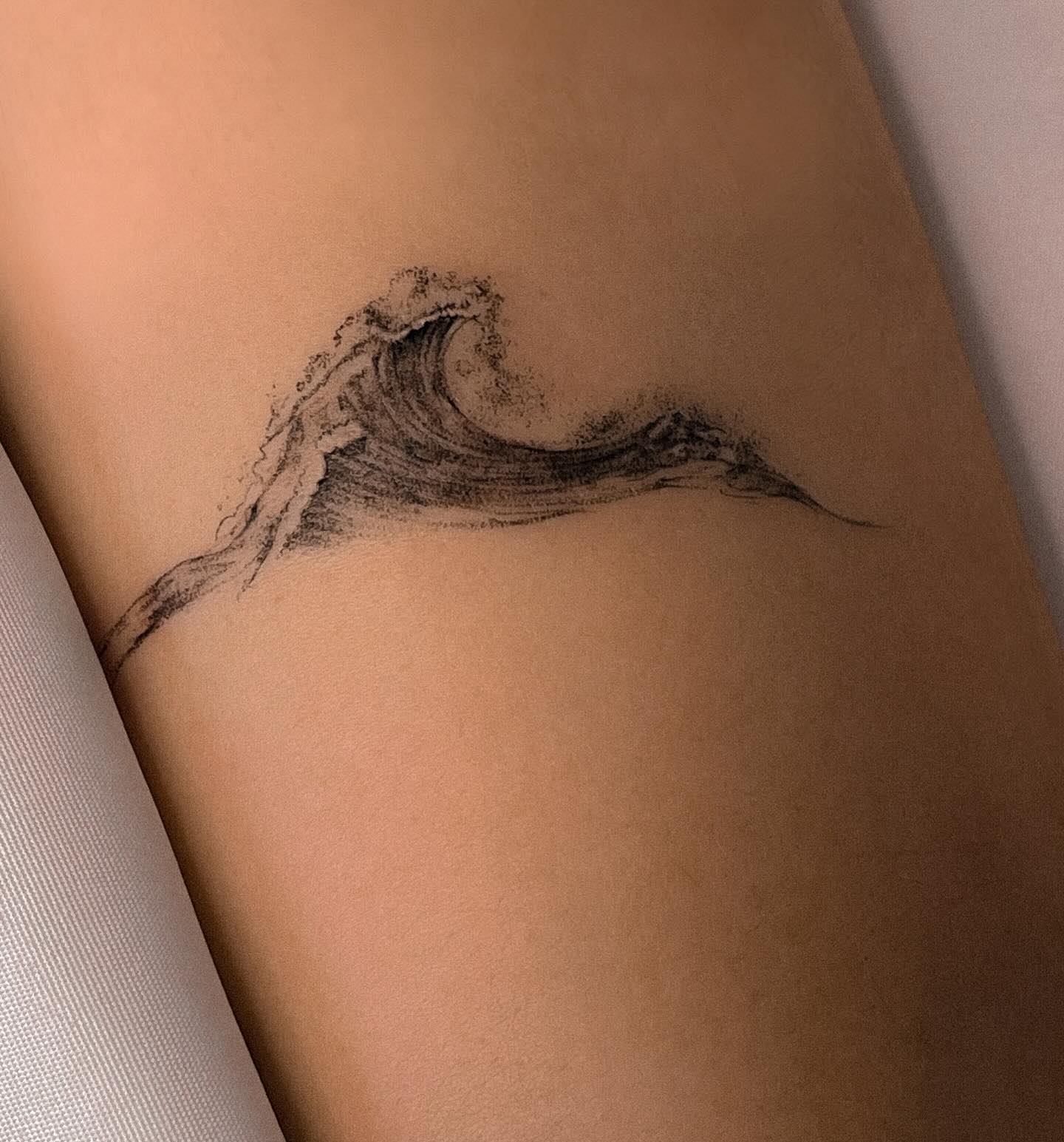 This tattoo showcases a delicate wave curling upward with a soft, sketch-like texture. The artist uses fine shading to bring movement and energy to the piece, giving the wave a natural, flowing appearance. Its placement allows it to feel both minimal and expressive.