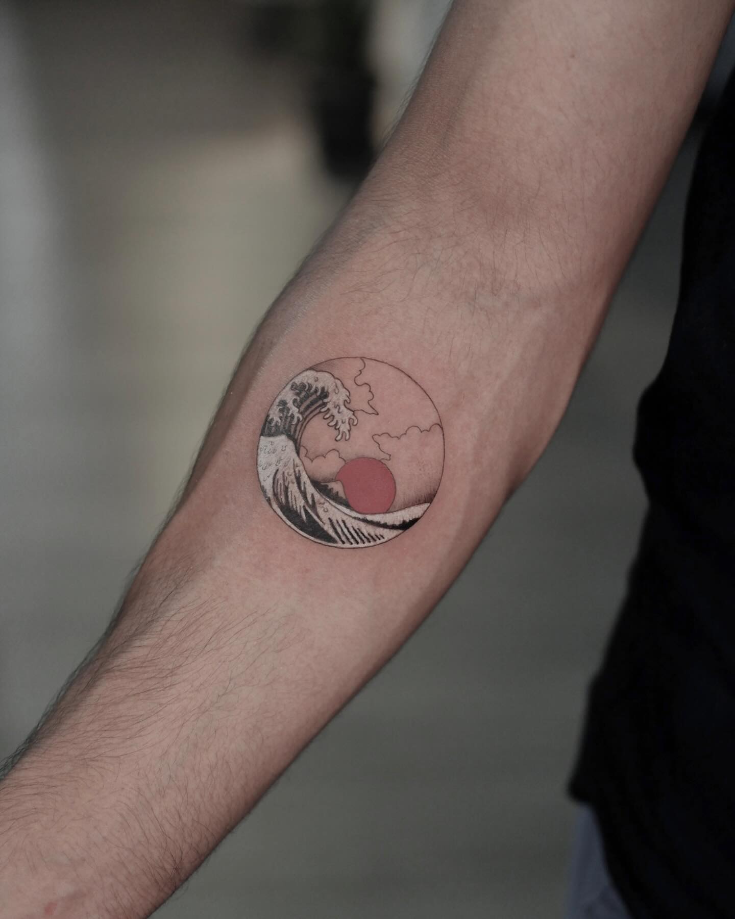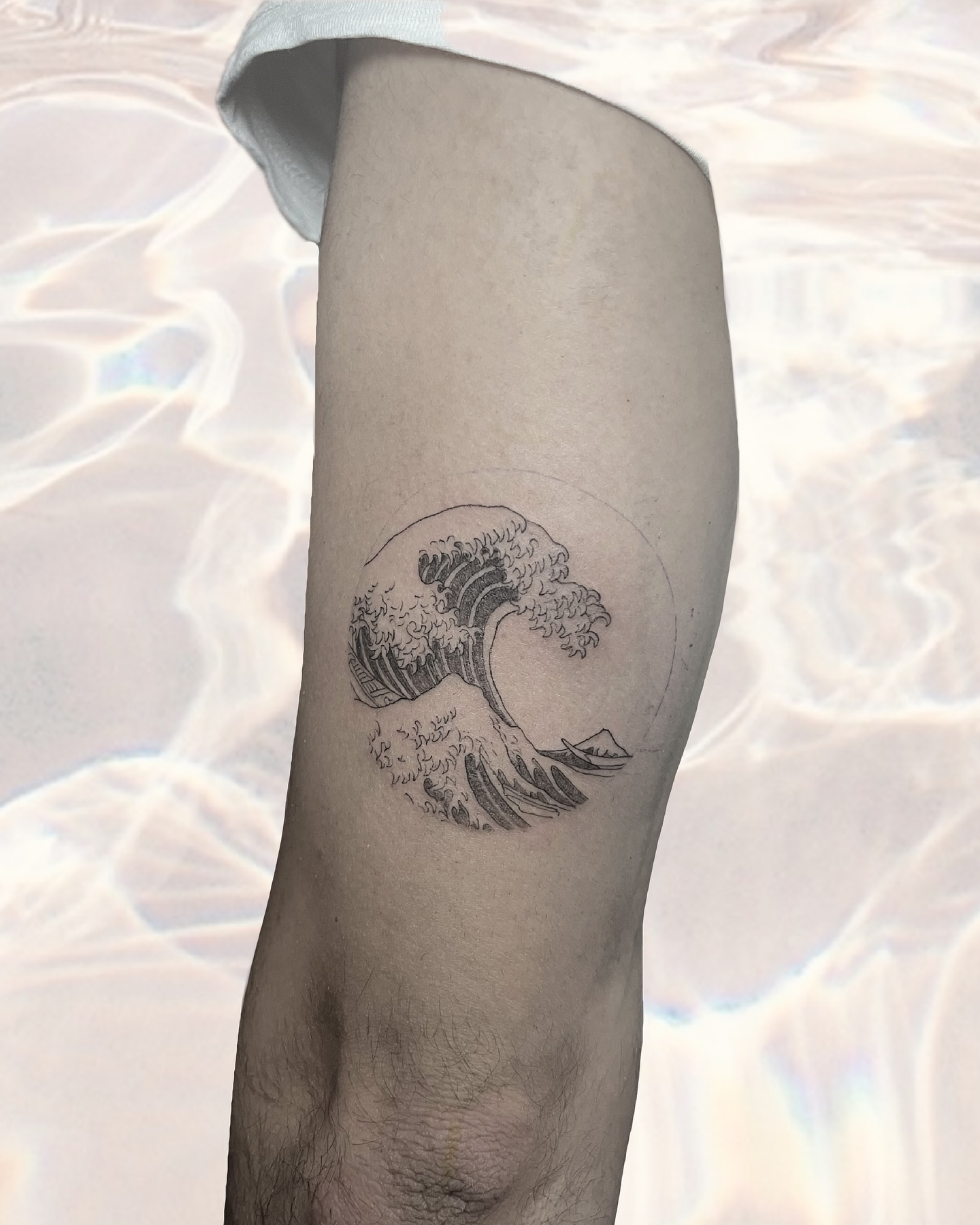 Here, the tattoo is presented in a circular frame, giving the wave design a sense of completeness and unity. The intricate linework highlights the crest and motion of the wave, creating an artistic resemblance to Japanese wave illustrations.