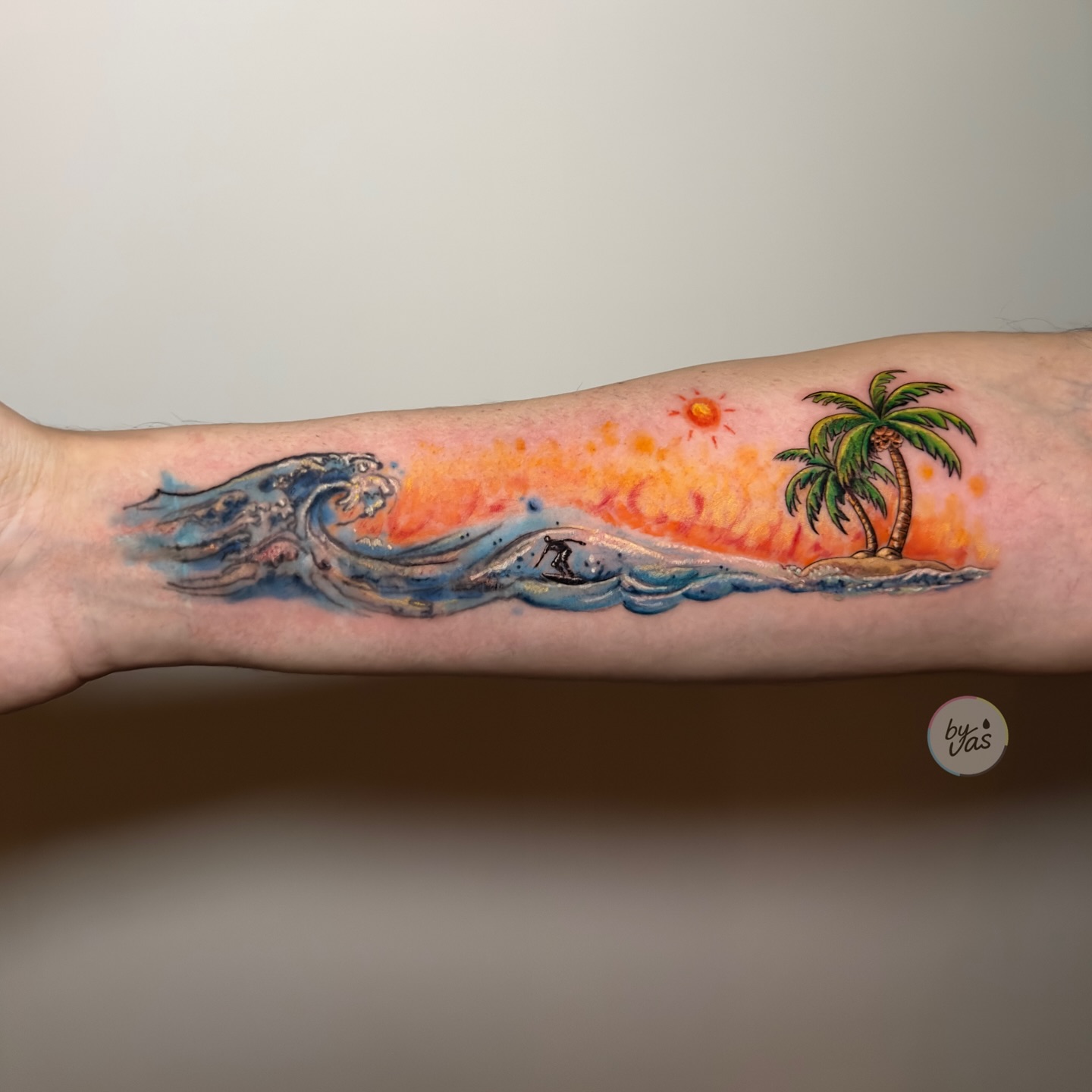 Symbolically, the tattoo celebrates freedom, exploration, and the joy of living in the moment. The wave represents energy and resilience, while the sunset and palm trees evoke peace and relaxation. It’s a colorful tribute to the ocean and the spirit of adventure.