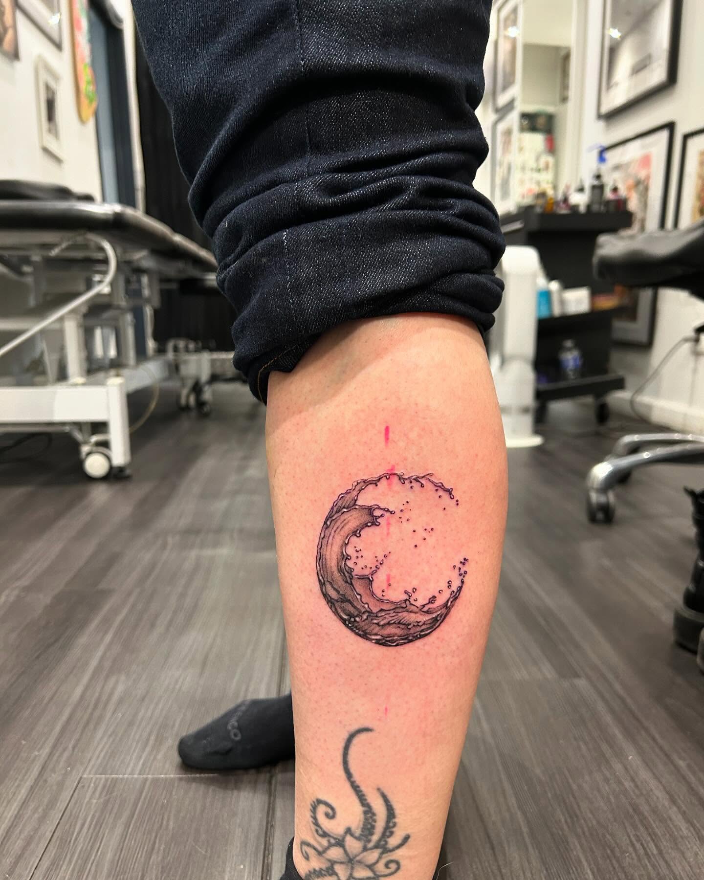 This tattoo depicts a wave shaped into a crescent, blending natural motion with celestial imagery. The design is sharp, detailed, and bold, with tiny droplets breaking off the wave’s crest to emphasize motion. Its placement on the calf ensures it stands out while complementing the flow of the leg’s shape.