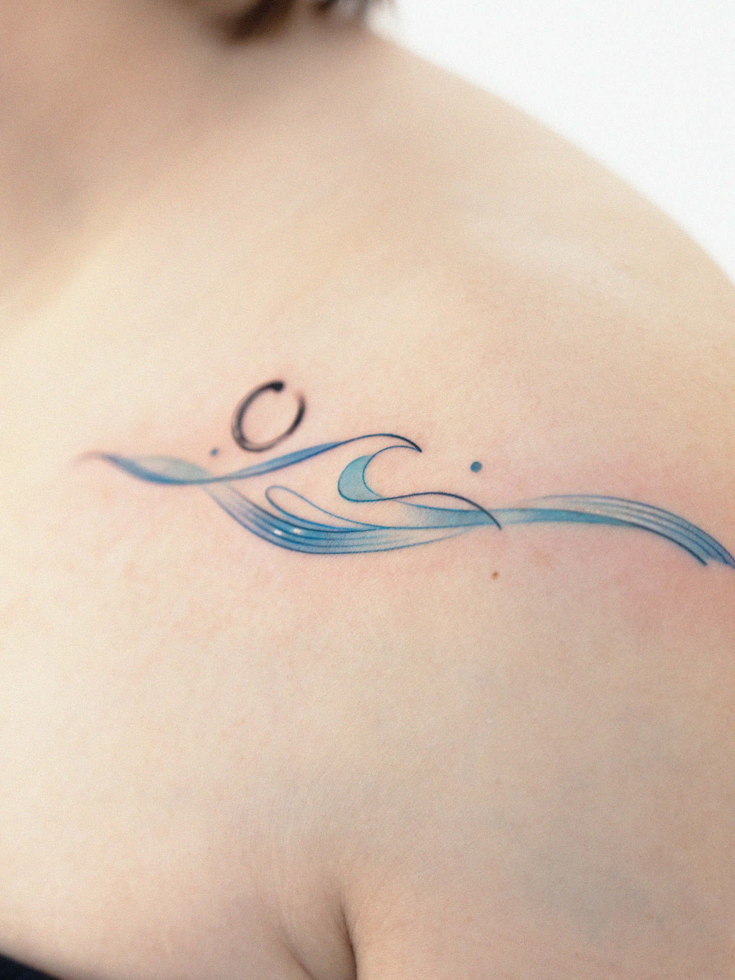 This tattoo features thin black outlines filled with hints of blue shading to create a tranquil series of flowing waves. The design stretches horizontally across the back shoulder, blending naturally with the body’s contours. Its understated style is subtle yet captivating, making it ideal for those who prefer minimal designs.