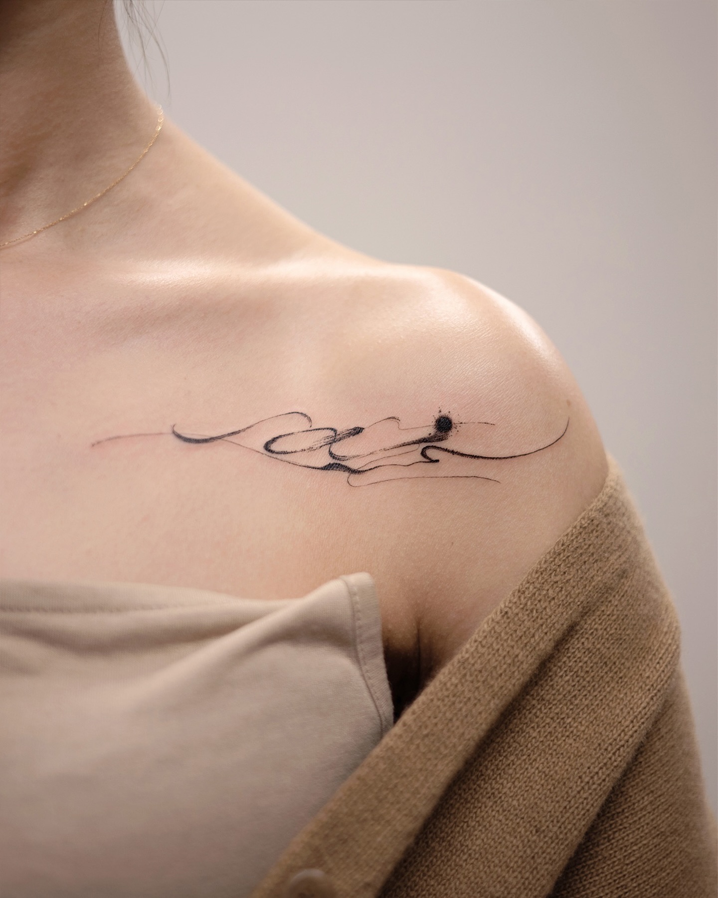 This tattoo features an artistic wave design with flowing, calligraphy-like lines, ending in a small black dot. Its minimal yet expressive style creates a sense of movement and mystery, blending elegance with modern abstract aesthetics. The thin placement on the collarbone makes it both delicate and bold.