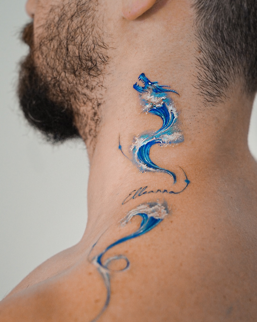 This striking tattoo transforms ocean waves into the shape of a dragon climbing up the neck. The bold blues and foamy whites create texture, while the dragon form adds mythological power. Its placement makes it dramatic and eye-catching, perfectly blending art and symbolism.