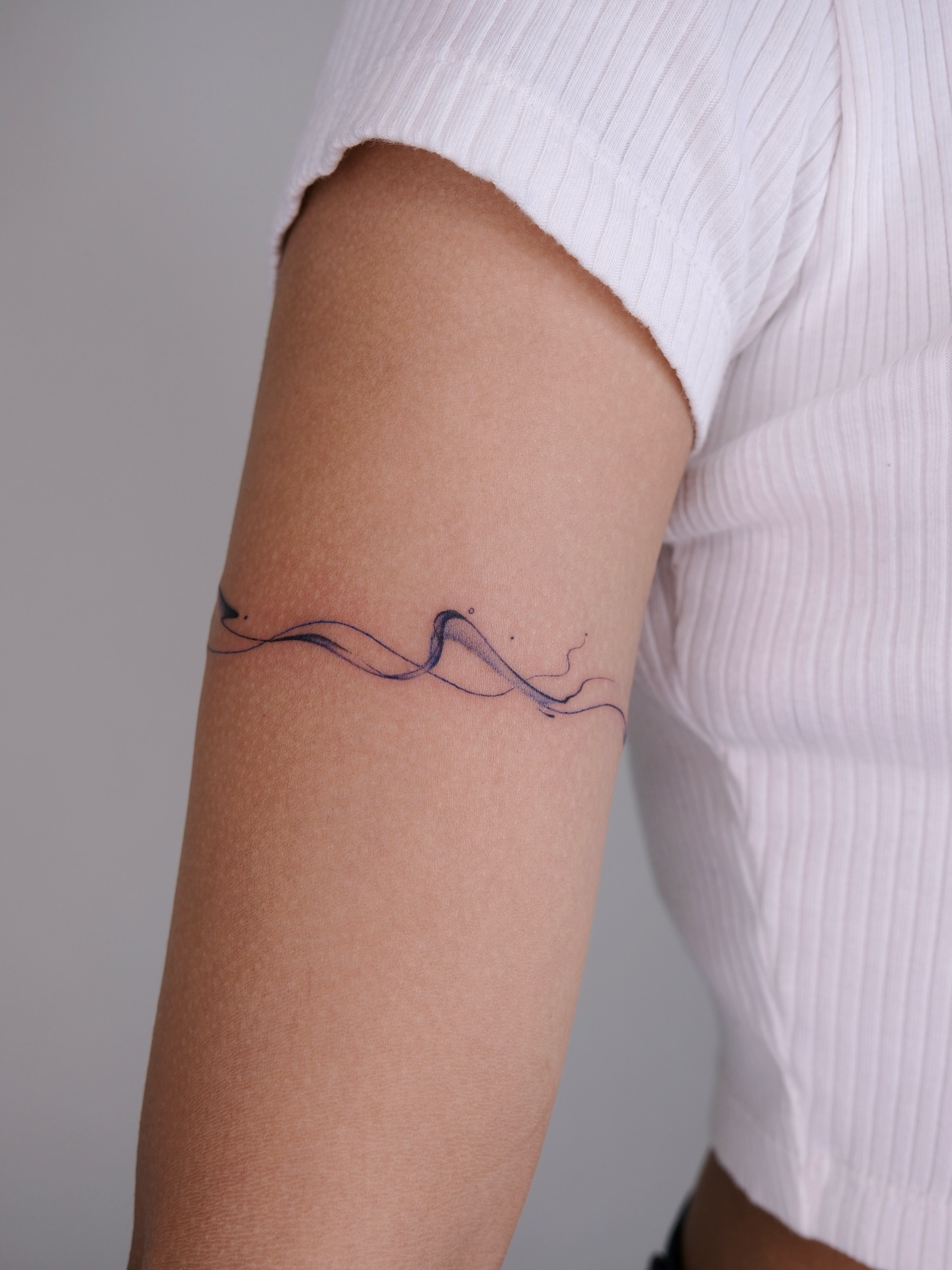 The last tattoo features a fine-line wave with an abstract, flowing form across the shoulder. Its strokes are thin and expressive, merging natural curves with artistic flair.