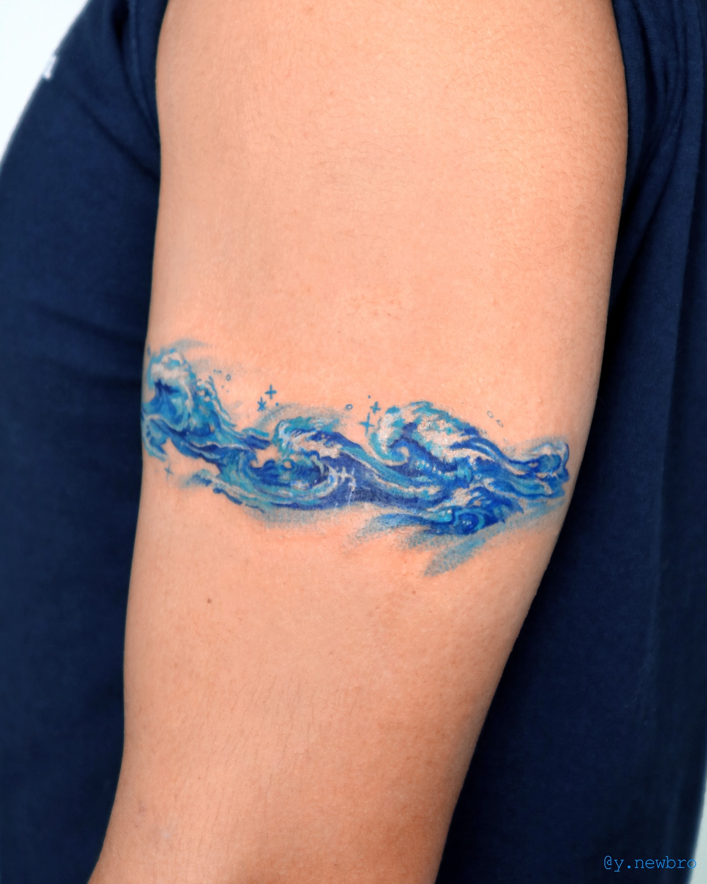 This tattoo bursts with energy, featuring a band of vivid blue waves wrapping around the arm. The layered shades of blue and white highlights give it depth and motion, almost as though the waves are alive. Tiny spark-like details add a sense of magic, making the design pop beautifully against the skin.