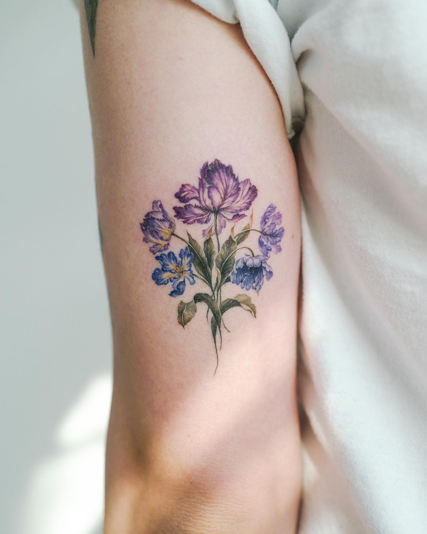 Flowers in purple hues often symbolize mystery, creativity, and admiration. This design is not just decorative but can also reflect individuality and a sense of wonder. Its painterly finish makes it resemble a piece of art on the skin, showcasing both skill and elegance.