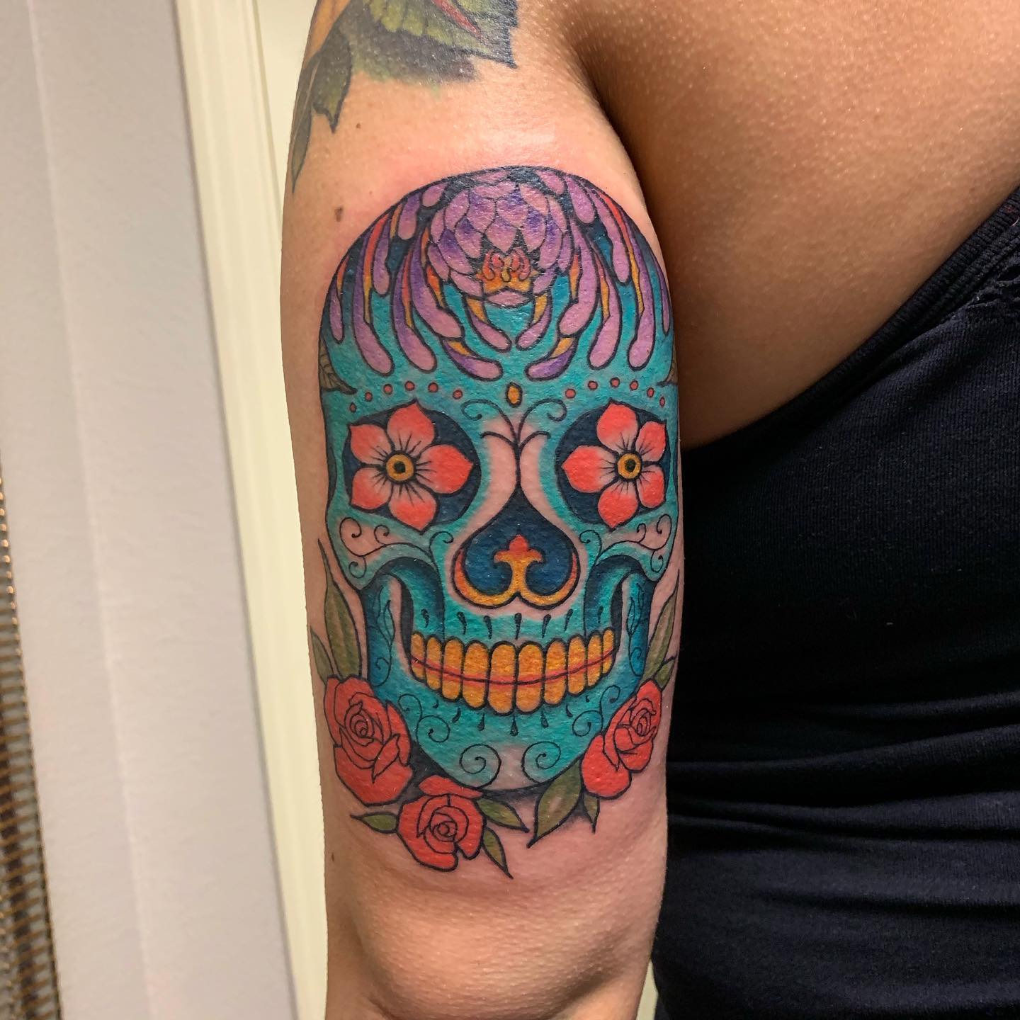 This design celebrates life and memory in a highly expressive way. The bright palette makes it a perfect tattoo for someone wanting to stand out, while the roses tie it back to themes of love, beauty, and remembrance.