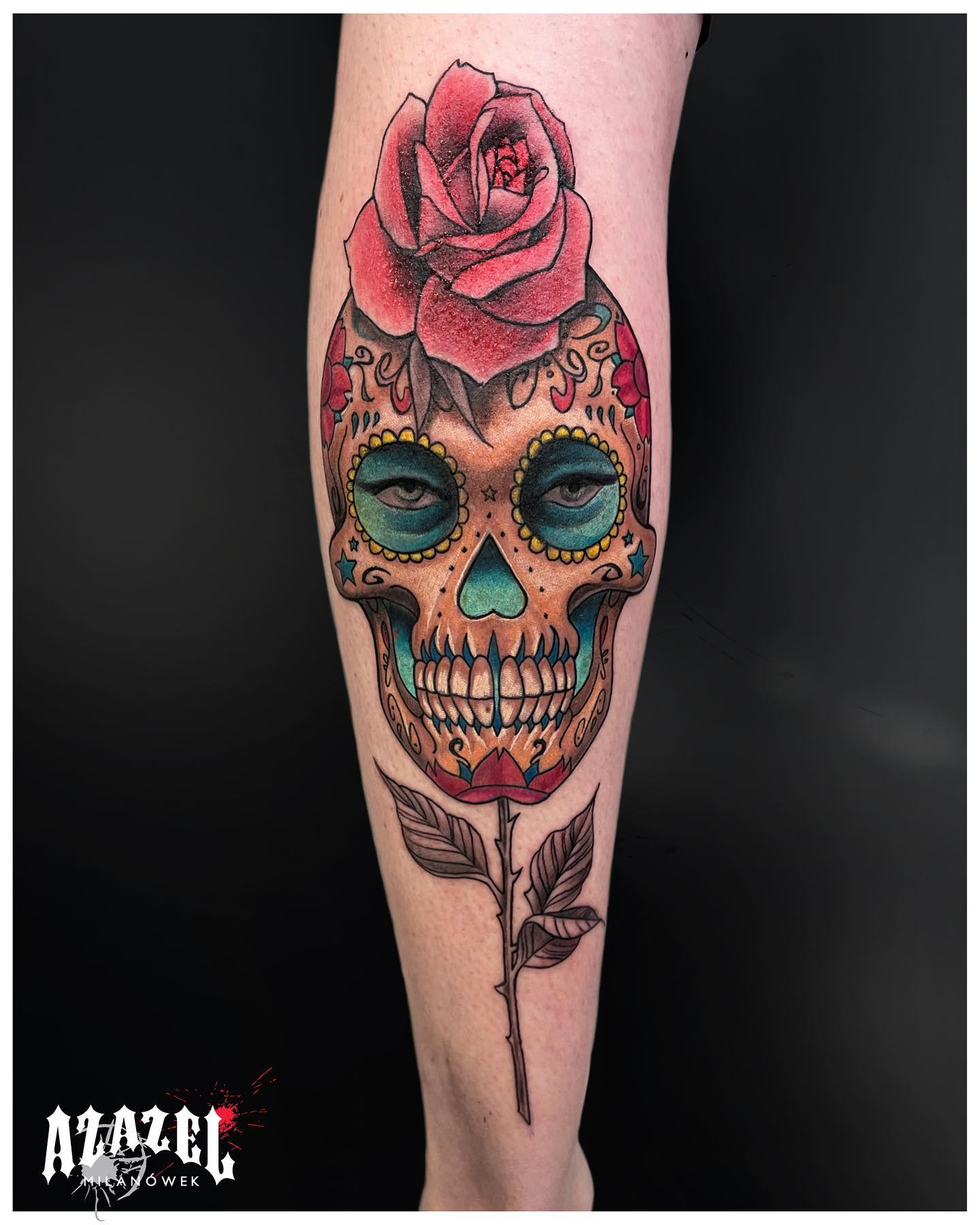 This design beautifully merges a vibrant sugar skull with realistic roses that crown its head. The skull is decorated with intricate floral details in vivid colors, symbolizing the balance between life and death. The realistic shading of the roses contrasts with the bright hues of the skull, creating a bold yet harmonious look.