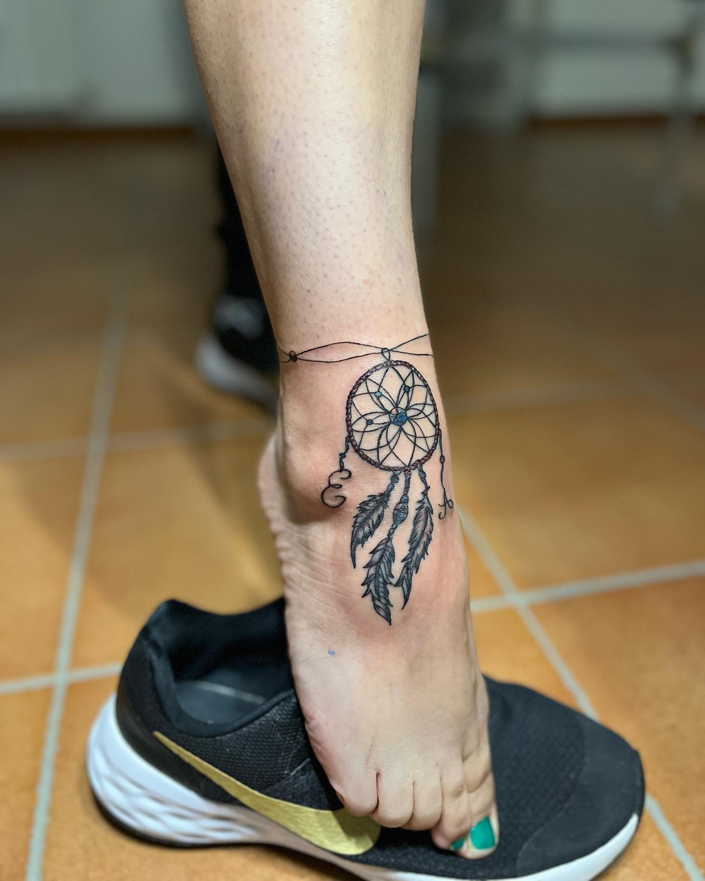 This tattoo appears like an anklet, with a thin band circling around the ankle, tied to a dreamcatcher resting on the side of the foot. The hoop features an intricate web, with three hanging feathers inked in bold black. The strands are decorated with tiny bead-like elements for authenticity.