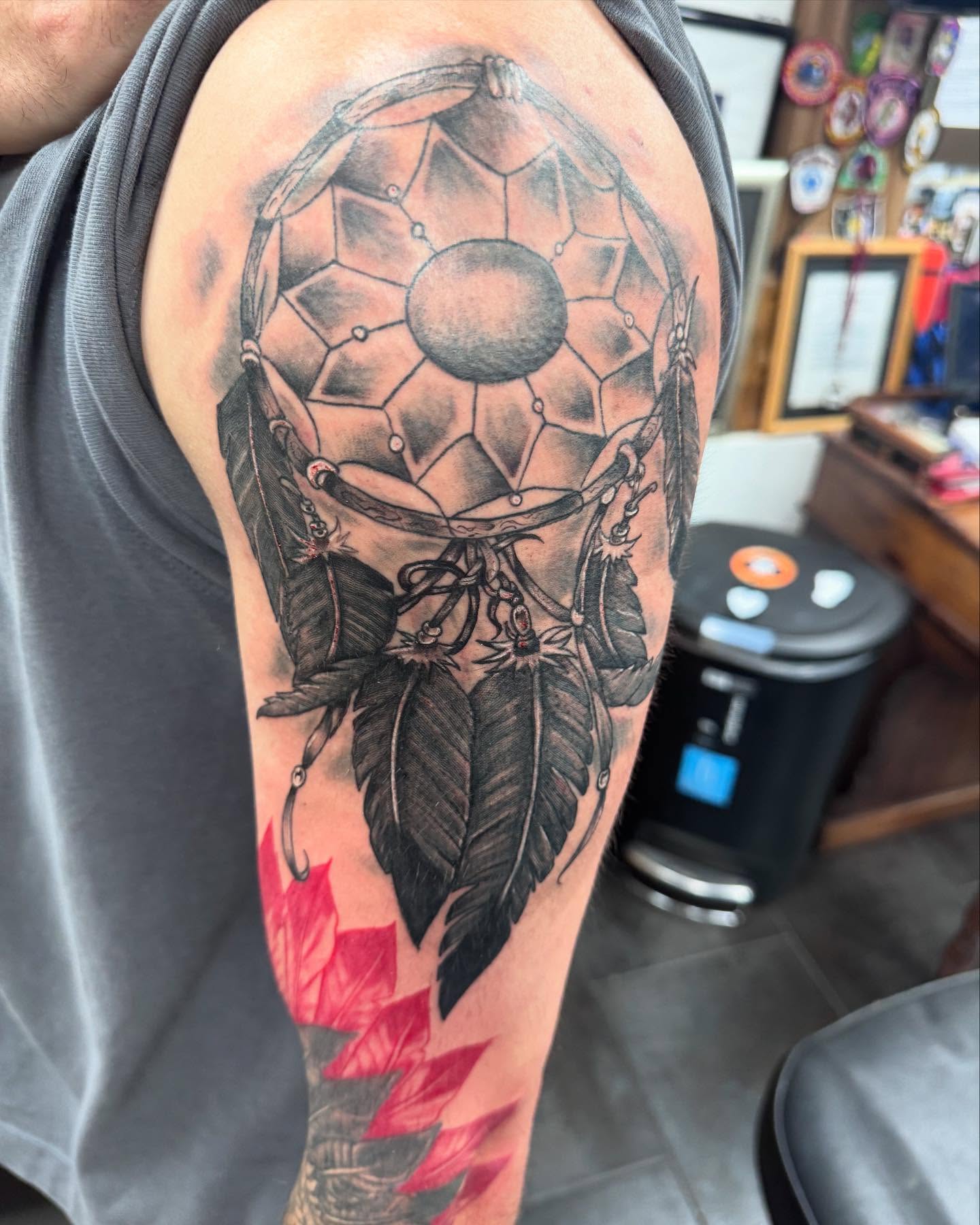 This shoulder tattoo commands attention with its heavy shading and bold black ink. The dreamcatcher’s hoop has a petal-like geometric pattern, with a solid circular center for grounding focus. Below, thick, detailed feathers cascade down, filled with dark shading to create depth and intensity.