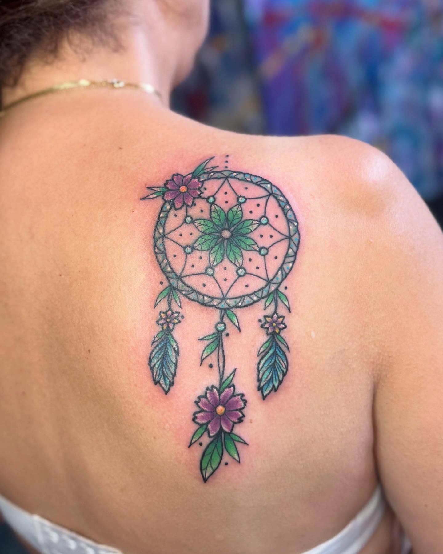 This tattoo on the upper back features a soft mandala design outlined with dreamcatcher webbing, accented by pink and purple flowers. The feathers beneath are shaded in turquoise and green, with vibrant blossoms completing the delicate, feminine touch.