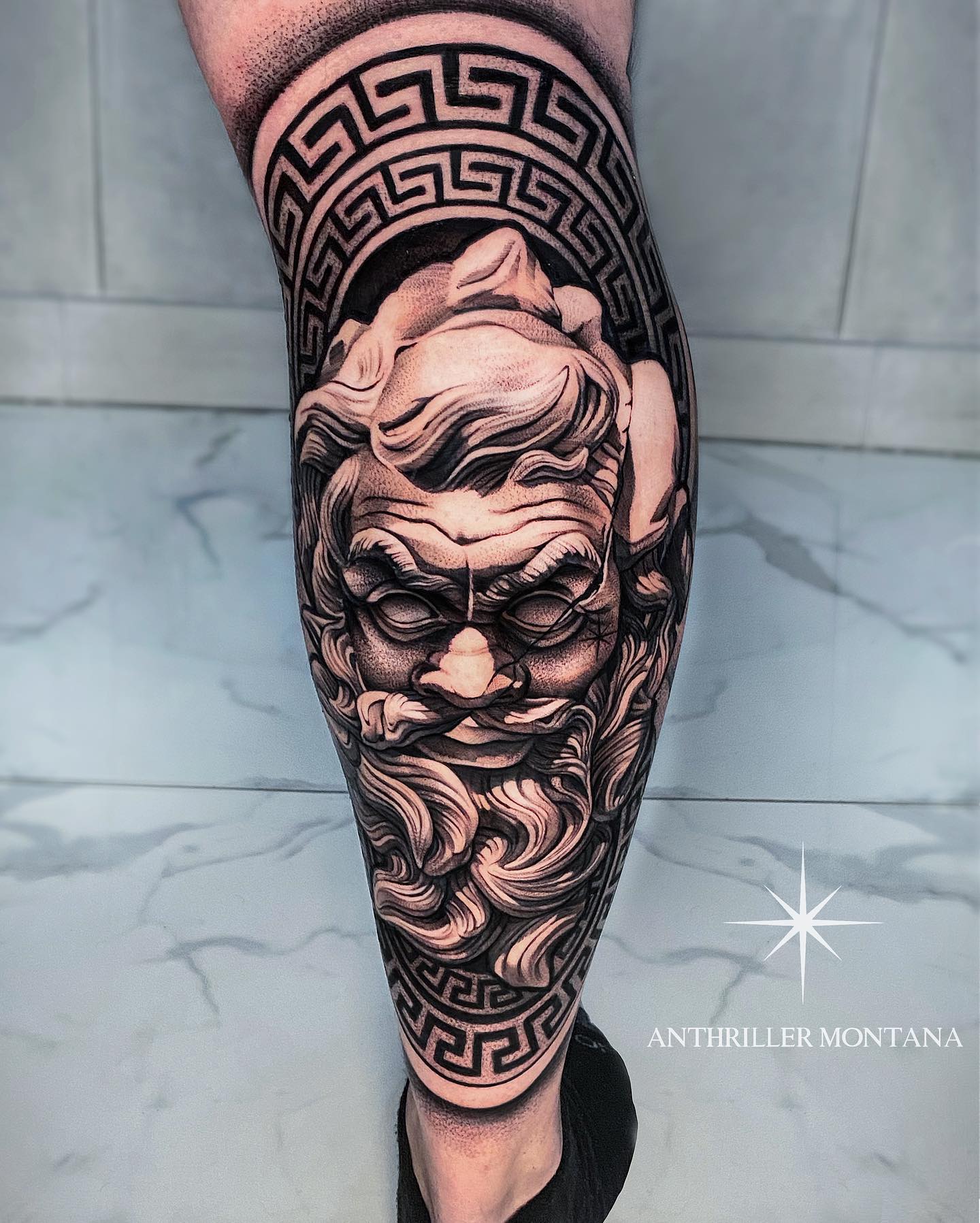 This tattoo showcases the face of a Roman god or ruler framed within bold geometric patterns inspired by Roman mosaics. The detailed beard and intense eyes convey wisdom, authority, and timeless strength. The surrounding pattern balances the realism with symmetry, adding both order and power to the design.
