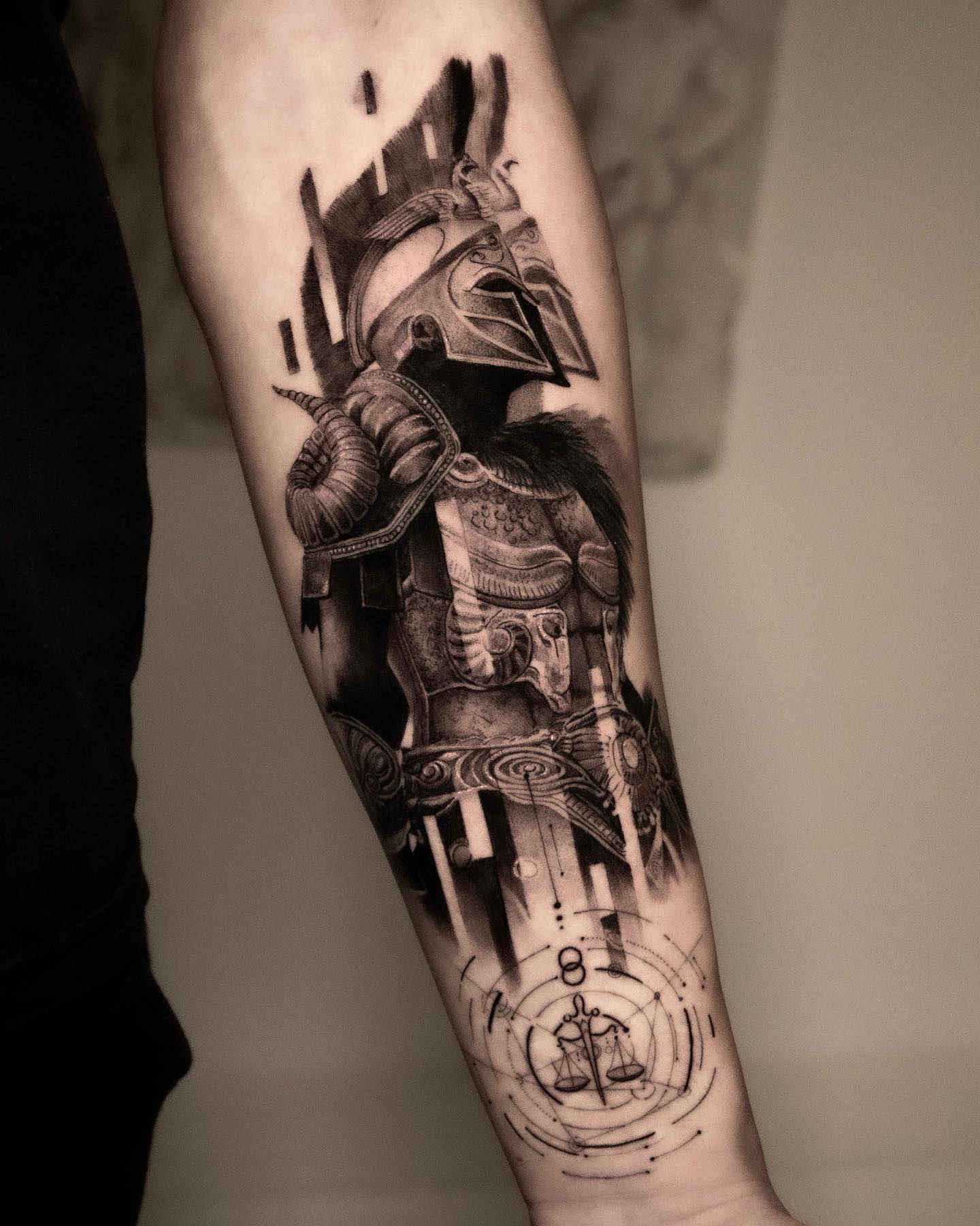 This striking tattoo features a Roman gladiator in armor, complemented by abstract patterns and the symbol of scales beneath. The design fuses brute strength with balance and fairness, suggesting that even warriors live by principles of justice. The detailed armor conveys bravery and discipline.