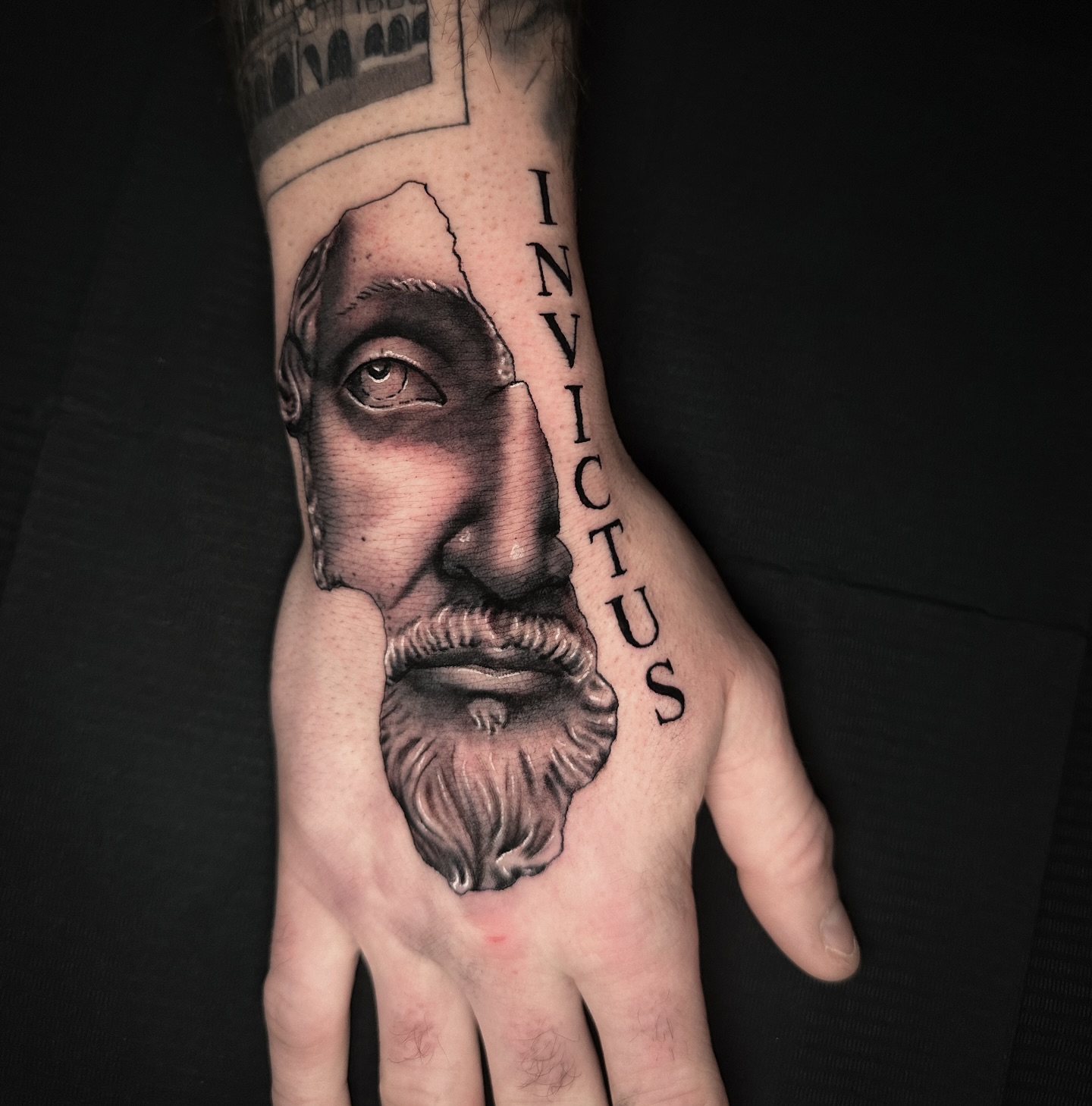 A dramatic tattoo showcasing a fragmented Roman bust across the hand, paired with the word “INVICTUS,” meaning “unconquered.” The fractured stone effect symbolizes endurance through trials while maintaining strength and dignity. The piercing eyes convey intensity and unshakable determination.
