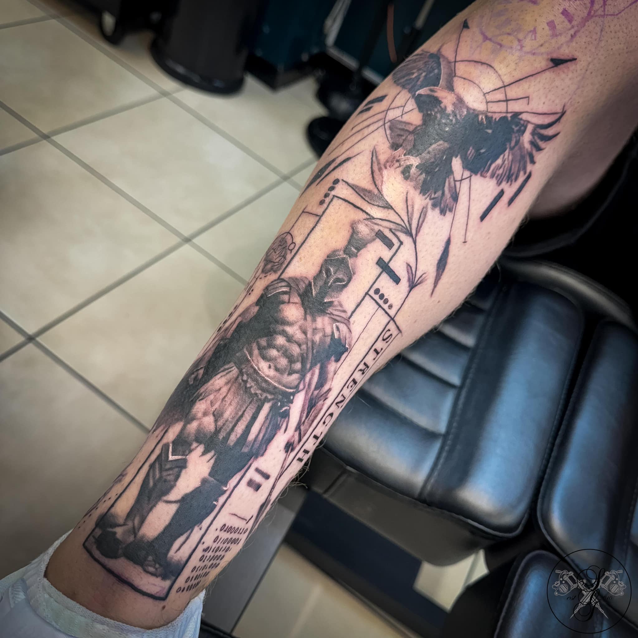 This elaborate sleeve combines Roman architectural elements, heroic figures, and the phrase “Memento,” meaning “remember.” A muscular warrior figure embodies strength and sacrifice, while the backdrop of Roman structures ties the tattoo to the grandeur of the empire.