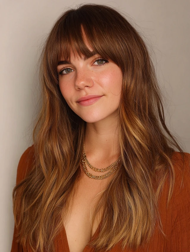 Long bangs look even better when paired with dimensional color. Subtle highlights or balayage enhance their shape and add depth. Smooth, straight textures emphasize precision, while tousled waves make them effortlessly boho. For finer hair, light layers and volumizing spray add fullness; for thicker hair, thinning shears help create softness and bounce.