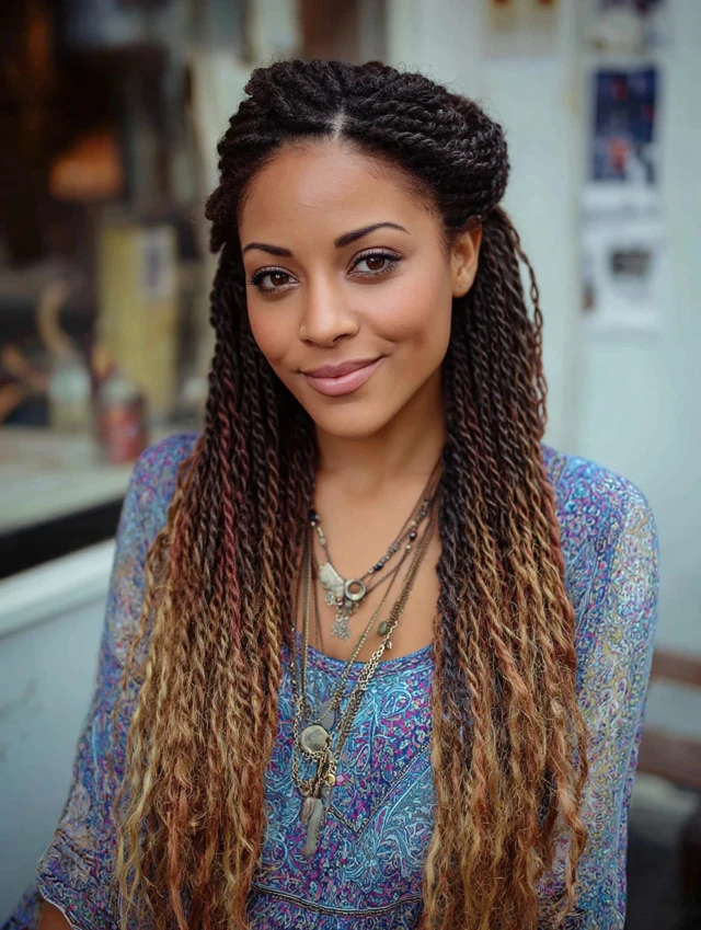 Front twists are softer than braids, while an ombre weave adds color transition and personality in the back.