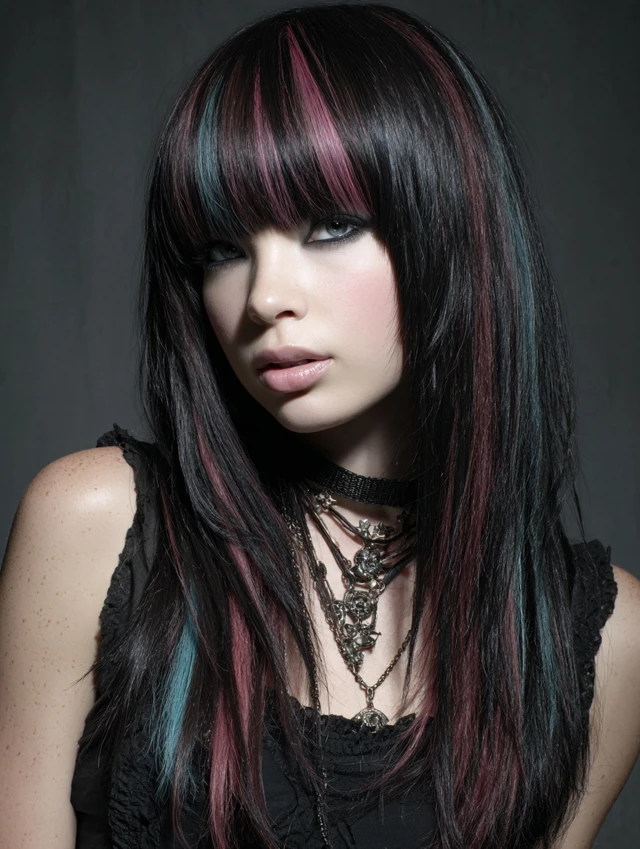 Straight hair accented with neon or pastel streaks gives a dramatic yet stylish emo/scene vibe.