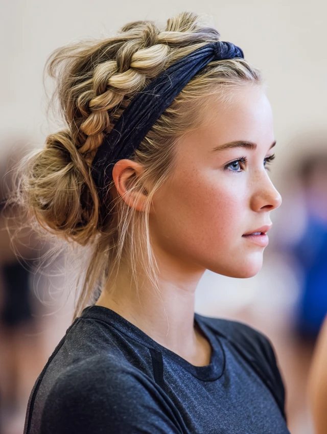 A low bun keeps hair contained while a headband prevents stray strands from hitting your face.