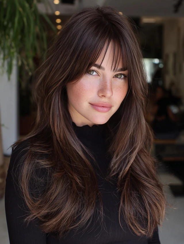 1. Long Layers with Side-Swept Bangs