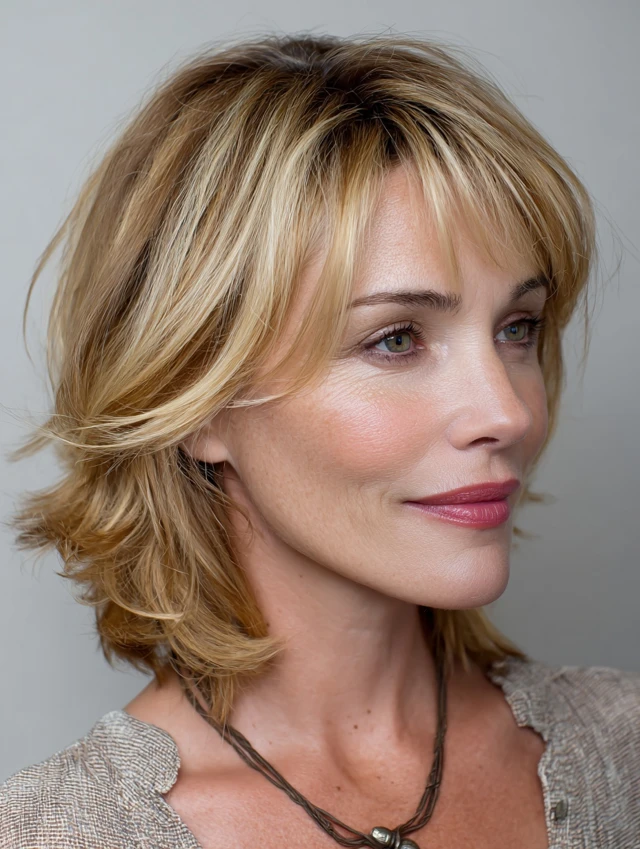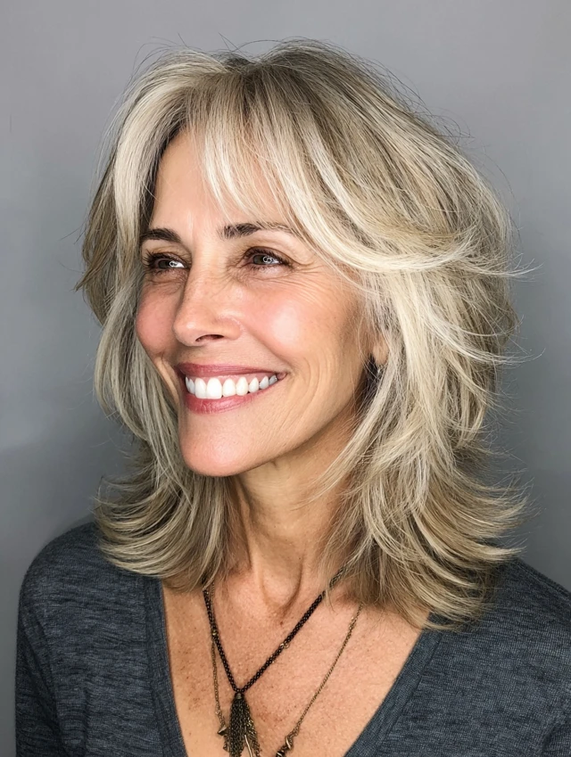 Medium-length hairstyles are the perfect balance for women over 50 — not too long, not too short, and incredibly flattering. This length softens facial features, adds movement, and keeps maintenance low while still allowing versatile styling options.