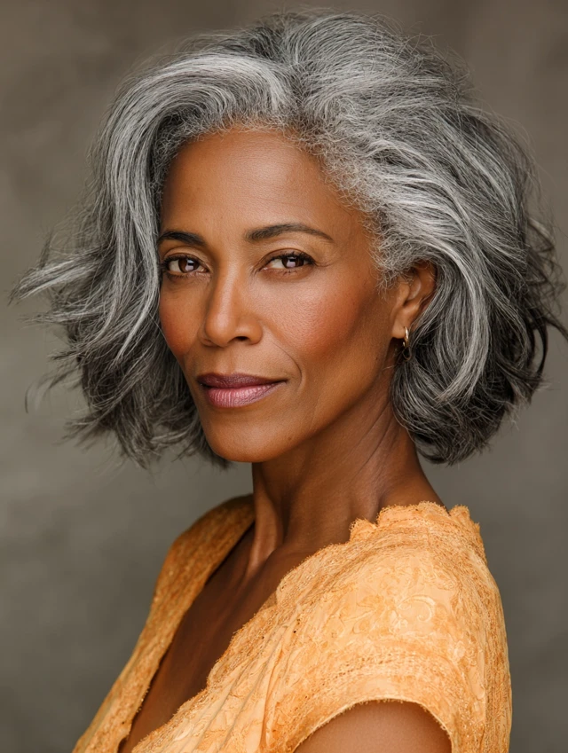 Gray hair shines glamorous and sophisticated in a layered or wavy bob, adding movement and dimension.