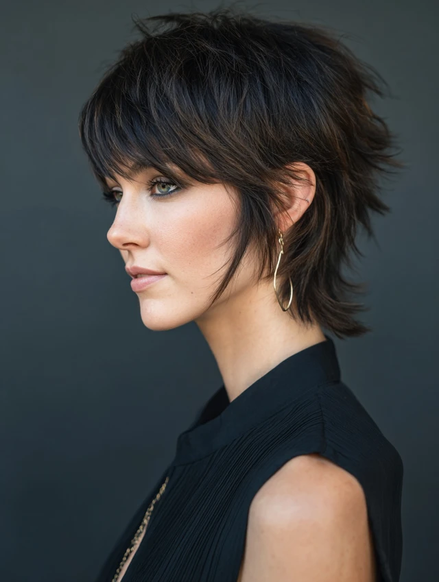 The short shag with bangs is a stylish haircut that blends textured layers with soft fringe for a relaxed, youthful look. This hairstyle is perfect for women who want volume, face-framing detail, and an effortless vibe that doesn’t require heavy styling.