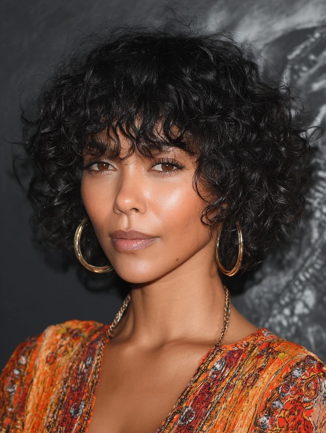 Soft, wispy bangs blend naturally with curls for a youthful look.