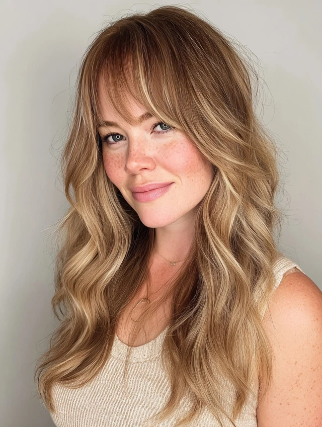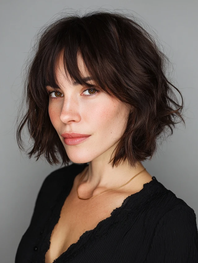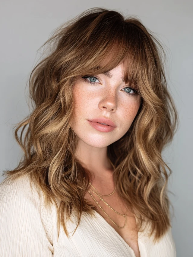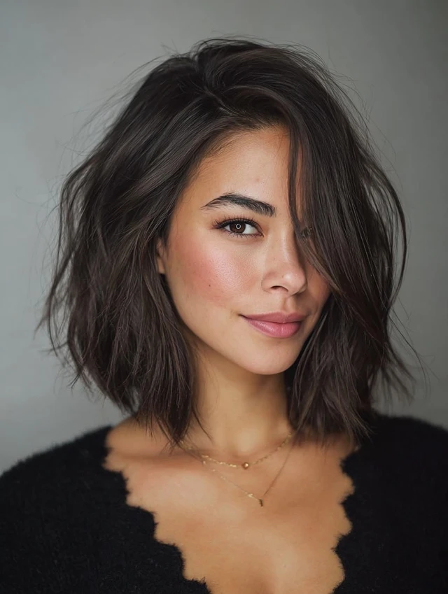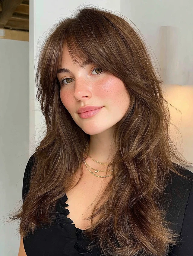 • Bangs: Curtain or side-swept bangs (avoid straight blunt bangs)