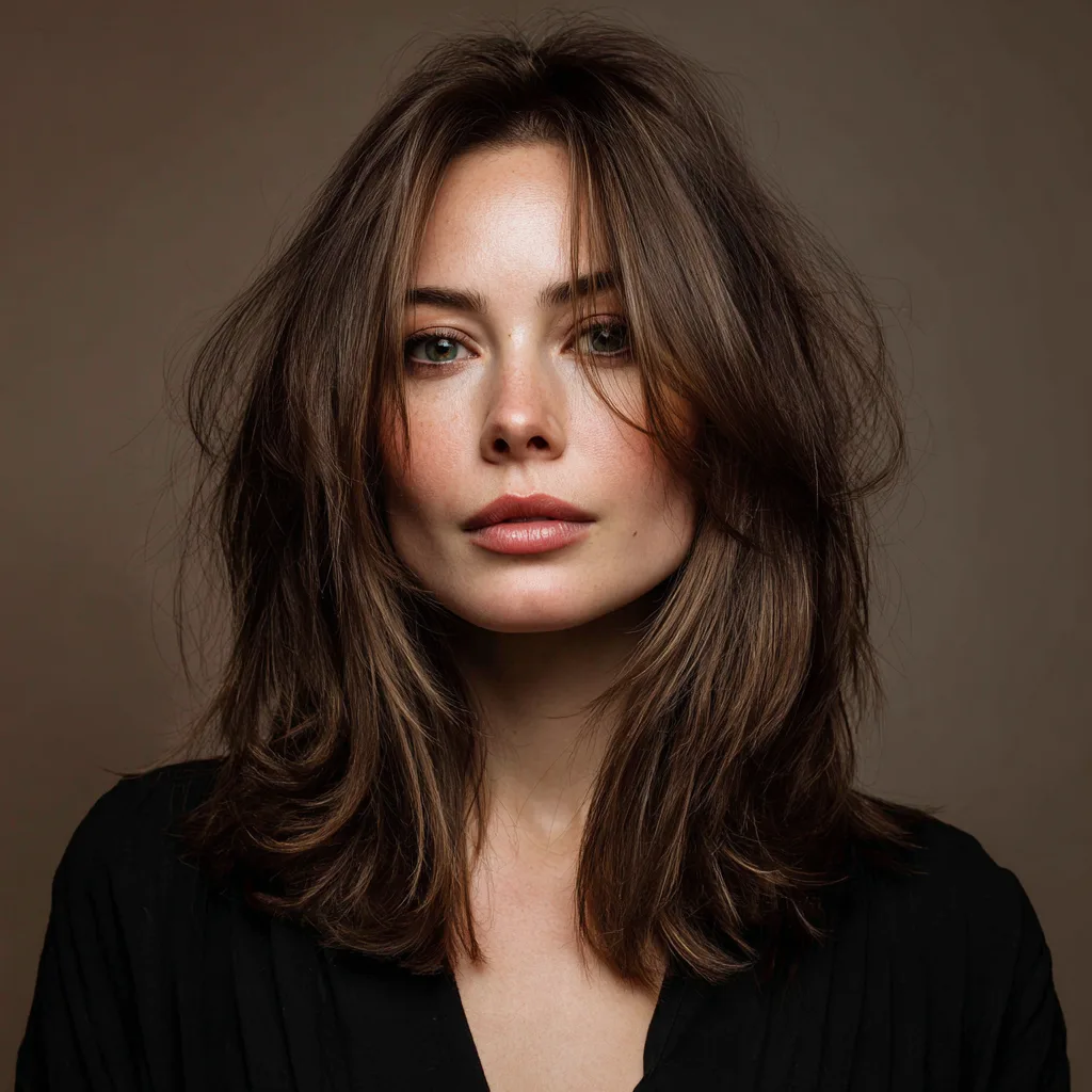 This style removes weight through long, blended layers while keeping the ends full. It works well for oval, round, and heart-shaped faces because it avoids harsh lines. Thick hair benefits from the layered structure, which prevents puffiness at the bottom. Styling stays simple. Blow dry with a round brush or air dry with a smoothing cream.