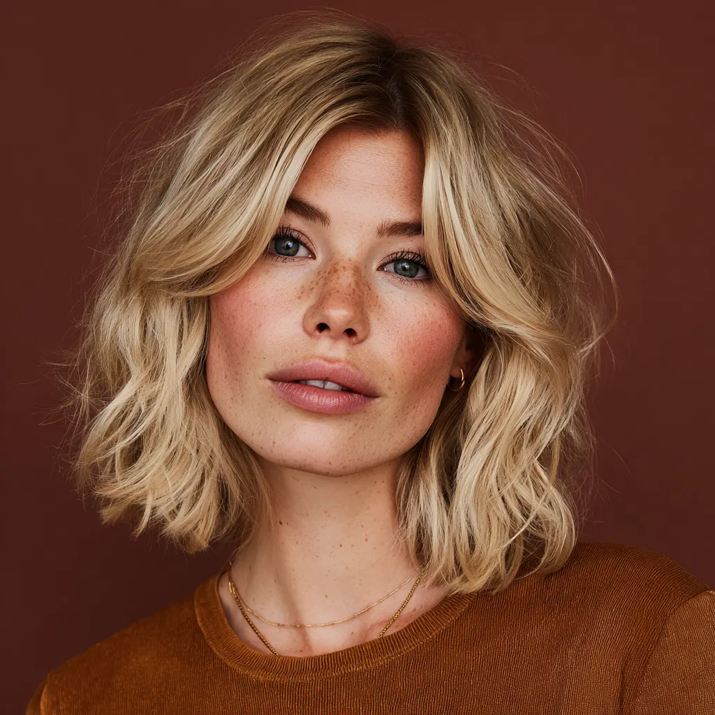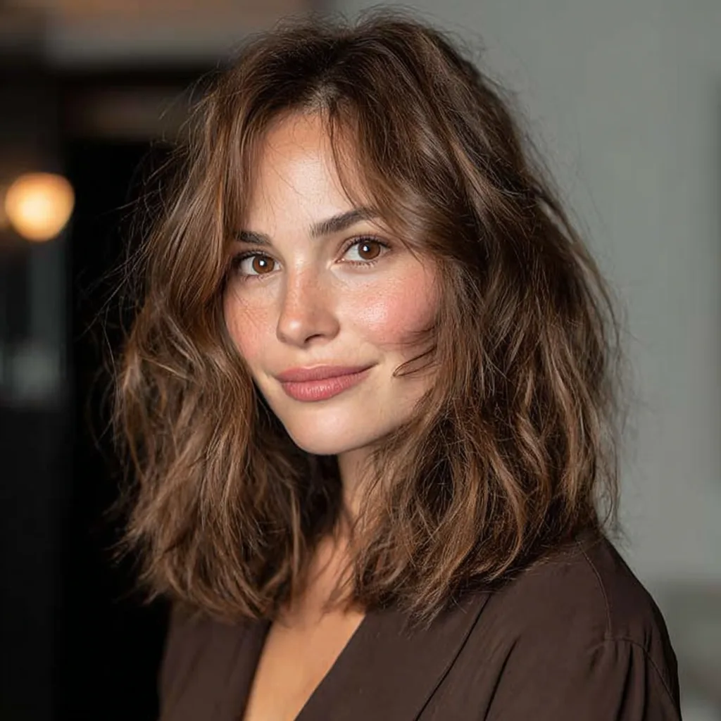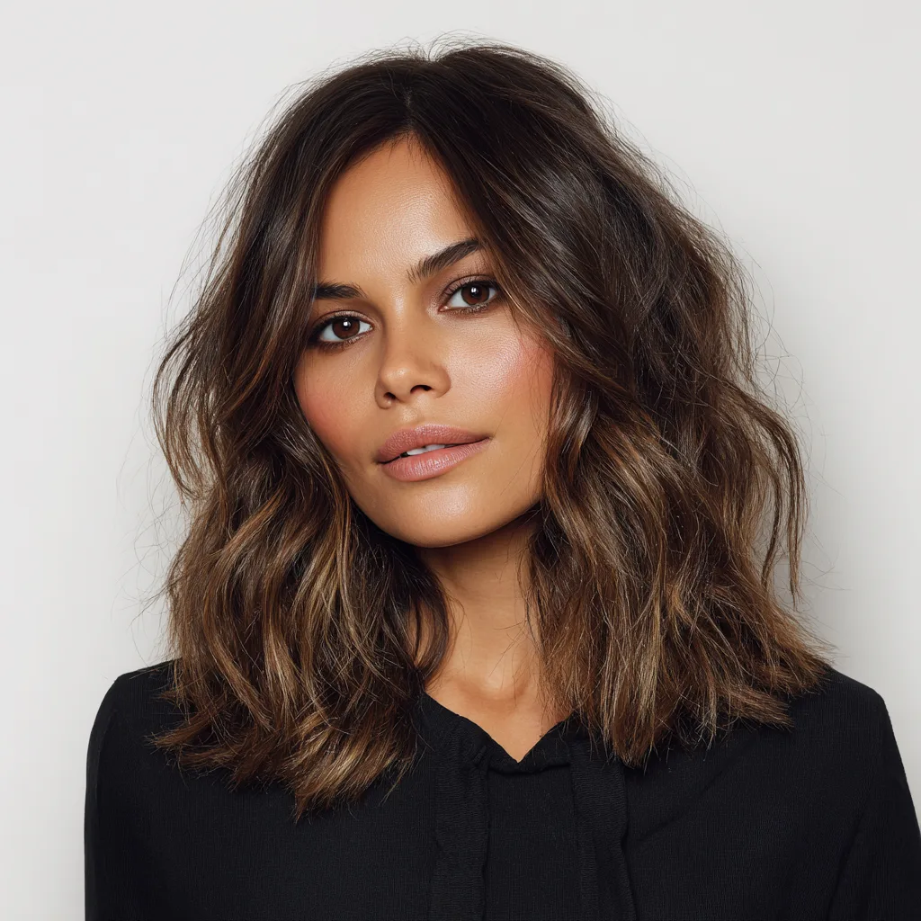 A wavy lob sits between the collarbone and shoulders, making thick hair easier to manage. Soft layers help waves fall naturally instead of stacking. This style works well for round and heart-shaped faces because it elongates the neck and frames the cheeks gently.