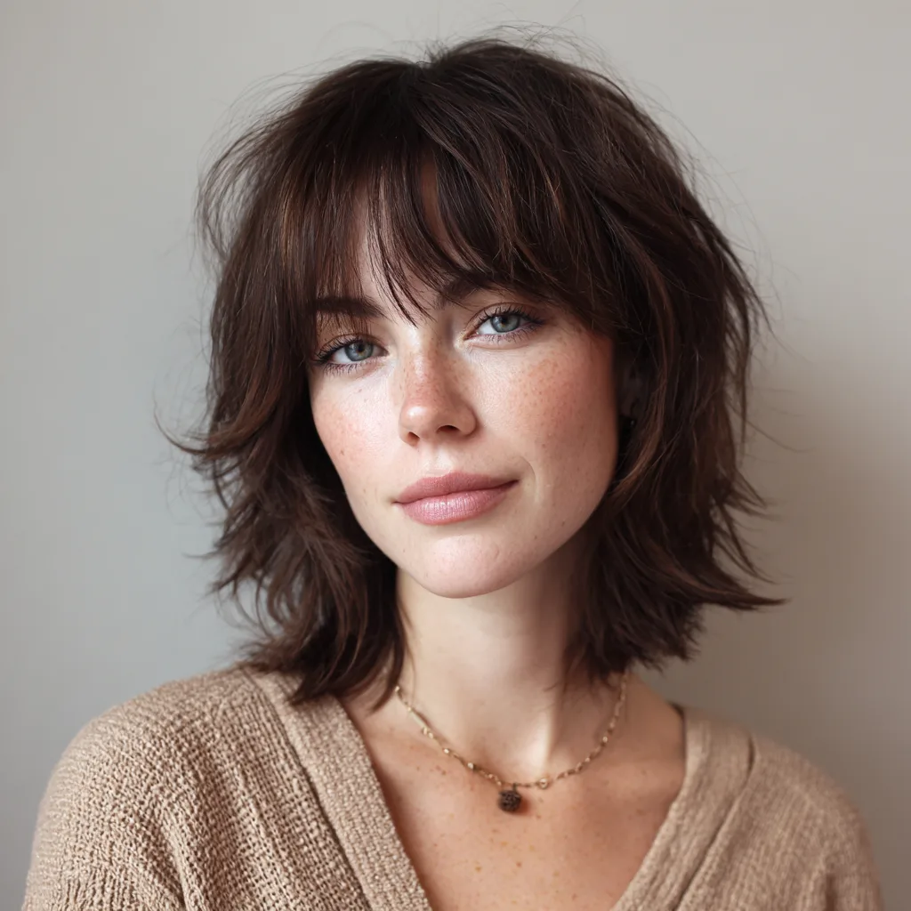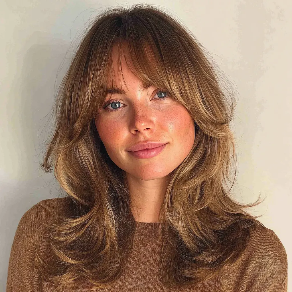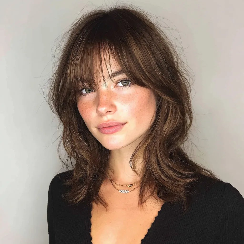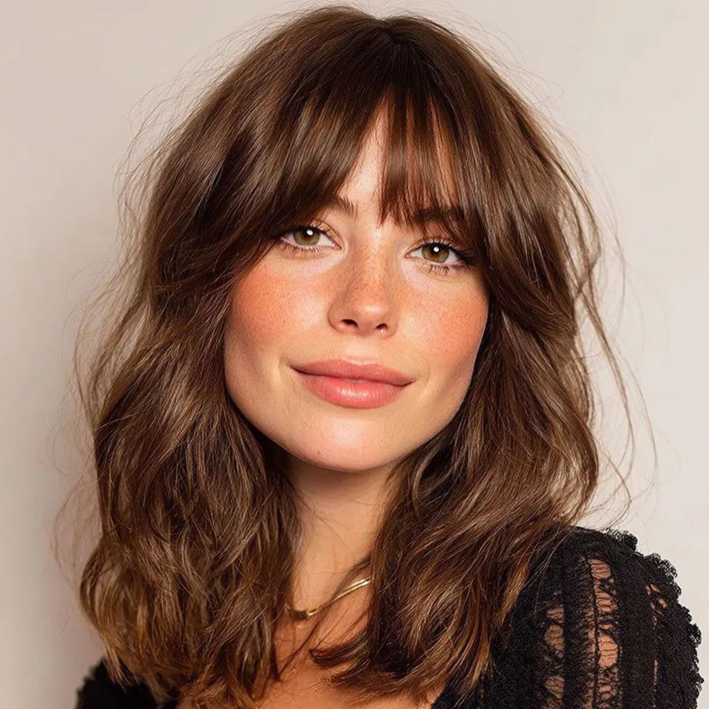 Styling bangs takes minimal effort with a round brush or flat iron. The rest of the hair stays simple. This cut works well for people who want a change without losing length. It grows out smoothly and stays flexible.