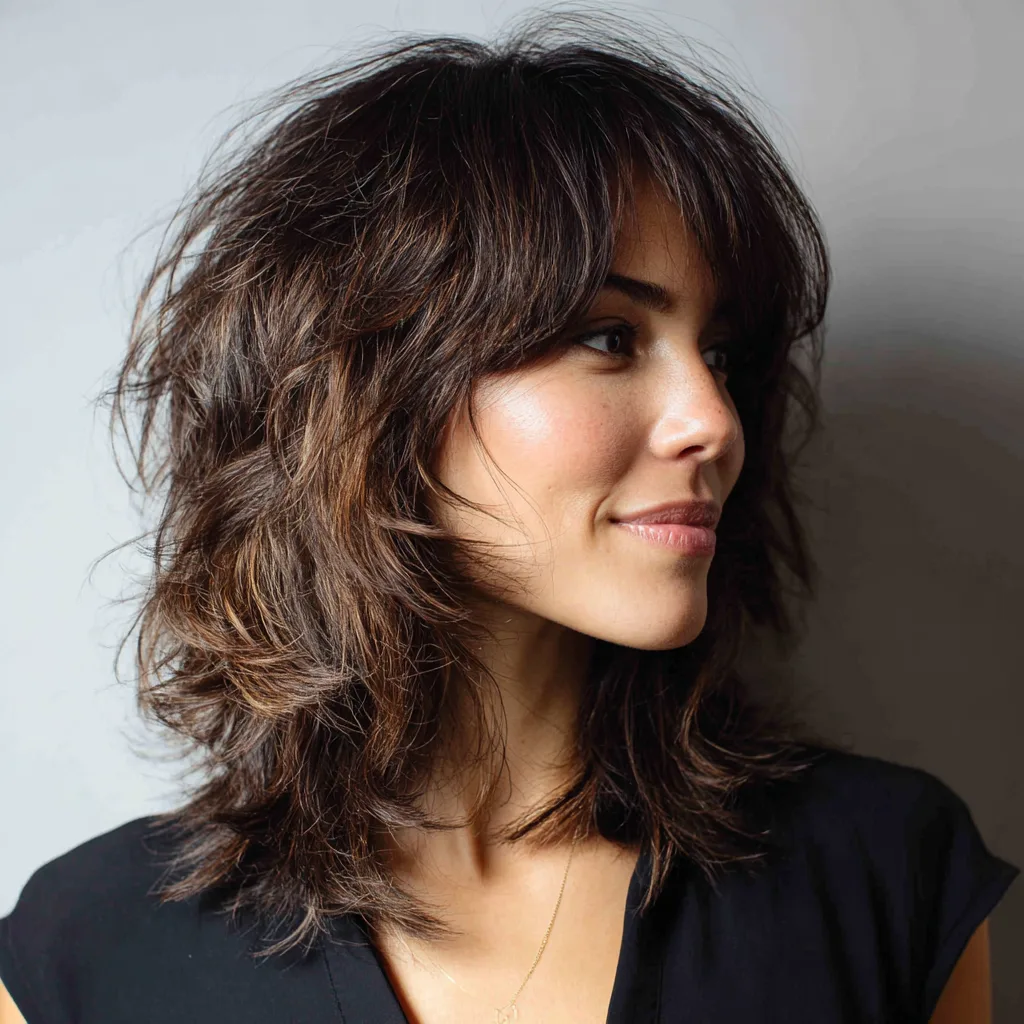 A medium shag adds movement and texture where thick hair often feels stiff. Choppy layers lighten the overall shape and reduce bulk at the crown. This style suits square and oval faces well, especially if you want softness around the jawline. Natural texture becomes an advantage instead of a problem.